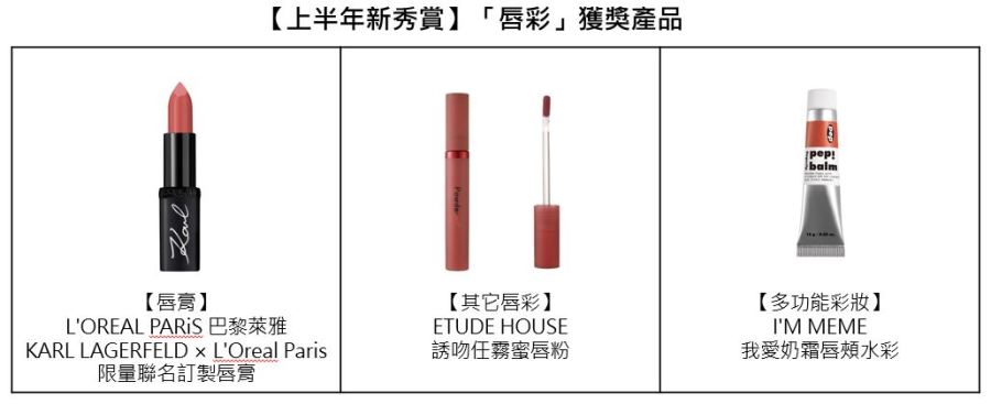 綜觀今年的上半年新秀的得賞品項,在彩妝的部分可以觀察到所有獲賞的產品屬性全部都是「開架品牌」,就連唇彩重點項目都被開架品牌所包辦,相較於2018、19年的上半年新秀獲賞品,尚不乏有備受矚目的專櫃唇彩羅列其中。而在本次獲賞的產品中也不難看出開架品牌為了吸引消費者費了不少心思,並打造話題感十足的產品,如L’OREAL PARiS 巴黎萊雅和ETUDE HOUSE都不約而同分別推出限量聯名款,前者與時尚老佛爺聯名推出老佛爺告別作唇膏;後者則與巧克力品牌HERSHEY’S推出特別的唇粉質地唇彩,也都獲得了很高的聲量。除此之外,由I’M MEME所推出的唇頰水彩,真的將產品製作成水彩的樣貌,亦獲得不少消費者的眼球關注!