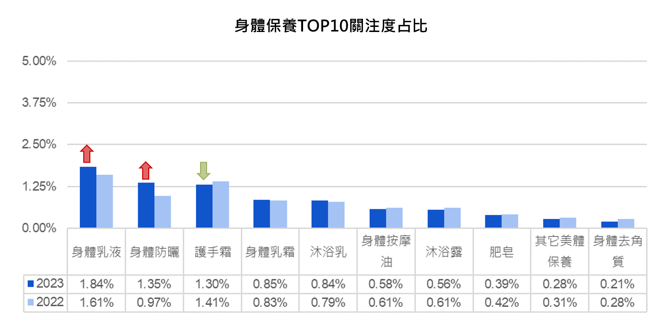 身體保養產品在2023年度和2022年度的關注占比則並無太多變化,天氣變化進入春夏後,消費者使用身體乳液、身體乳霜、護手霜等高關注度身體保養類產品的頻率降低,帶動整體身體保養關注占比自1月後開始降低。