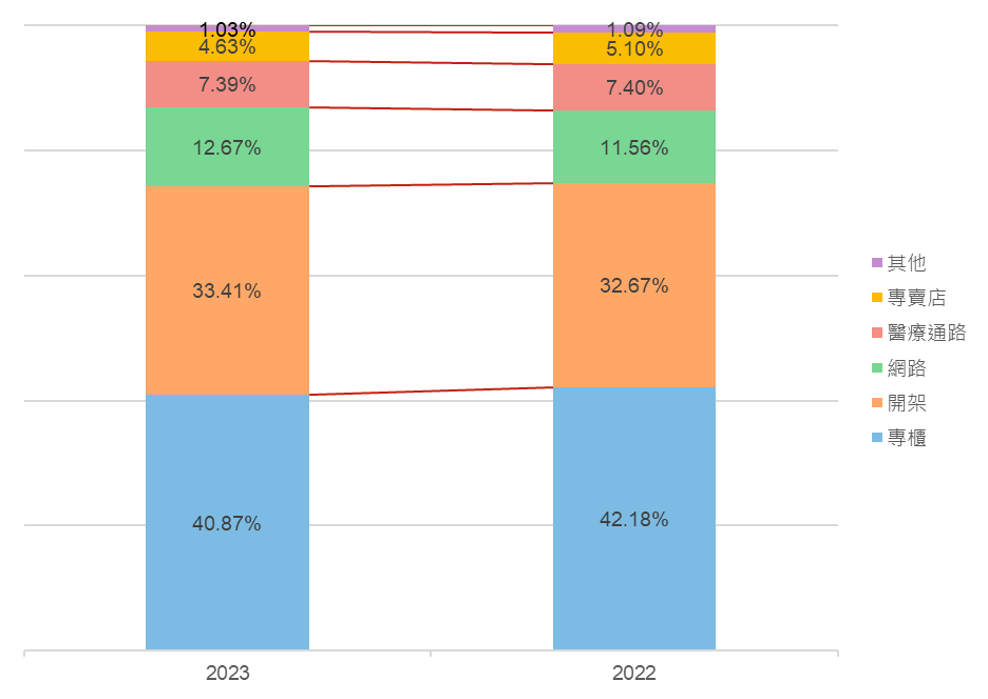 消費者於美髮產品的通路中,主要關注於開架及專櫃通路,其次則是網路與專賣店。與2022年對比,網路及醫療通路關注度上升,專櫃、開架及專賣店關注度有所下滑。