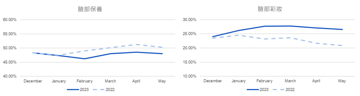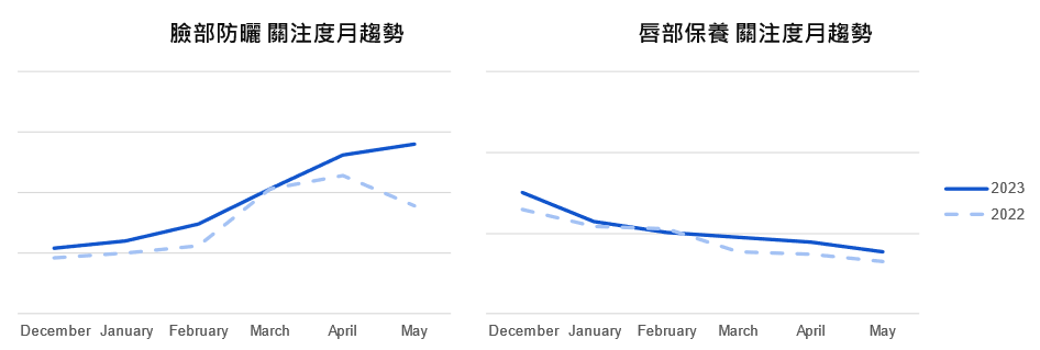 對比2022和2023兩個年度上半年的關注變化,發現臉部保養及臉部彩妝成相反走勢。2022年4月起,因台灣單日確診人數飆升,臉部保養關注度相對提升。而2023年2月底及4月中,隨著口罩禁令的兩次鬆綁,消費者露臉機會增加,對於臉部彩妝關注度明顯提升。