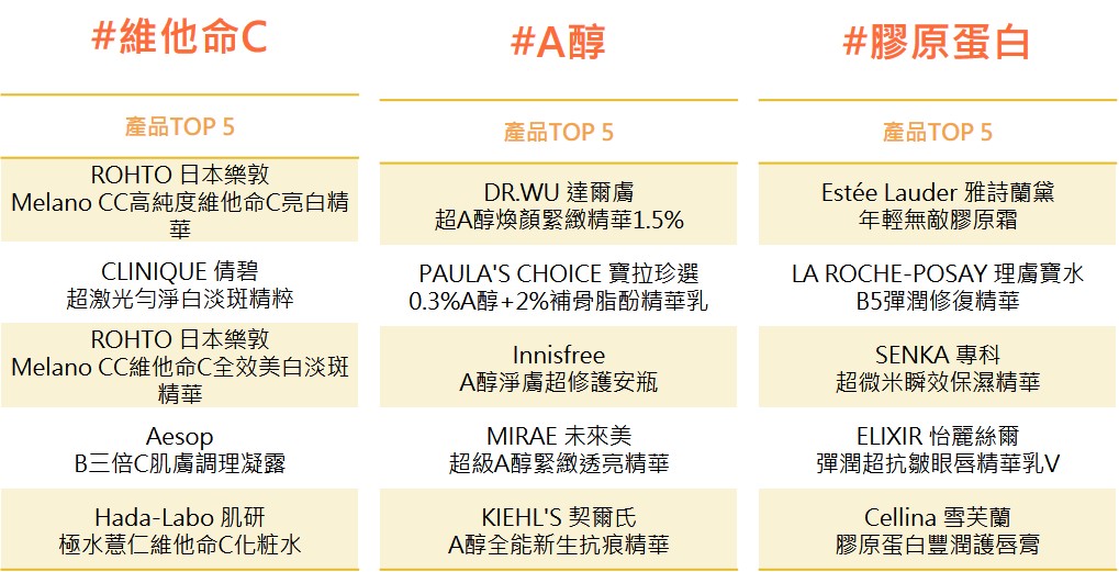 我們也發現2023上半年的保養趨勢,消費者在保養時更追求打造透亮、緊緻的膨彈肌,因此早C晚A、膠原蛋白等成份則成為上半年熱門美妝話題。