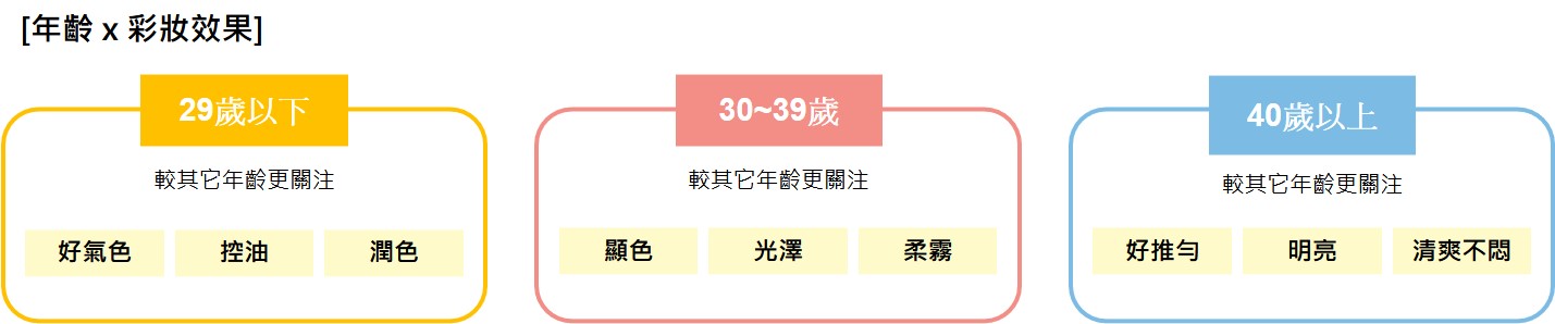 不同年齡層的消費者在彩妝效果關注上,29以下的族群對於維持自然輕透妝容更關心,因此在彩妝關鍵字上更關注好氣色、潤色及控油。30~39歲的消費者因為較其他年齡層更關注眼妝,顯色、光澤及柔霧則是此年齡層關注度較高的效果字。40歲以上則更在意解決暗沉及膚色不均的問題,明亮、好推勻及清爽不悶是他們較在意的彩妝效果。