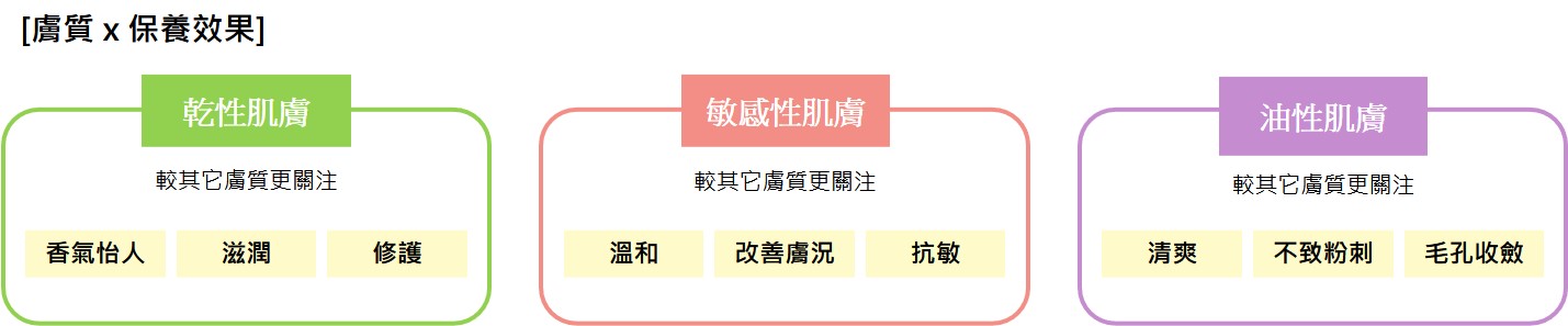 不同膚質、年齡層關注美妝效果關鍵字觀察不同膚質及不同年齡層的消費者,對於美妝效果的關注皆有所不同。膚質方面,乾性肌在選擇保養產品時,更注重滋潤、修護及香氣怡人等關鍵字。敏感肌則更專注在溫和、抗敏及改善膚況等有助於改善敏感狀況的關鍵字。油肌消費者則更關注清爽質地、不致粉刺及毛孔收斂等毛孔粉刺相關議題。