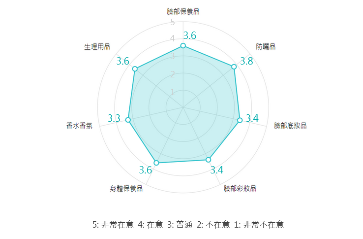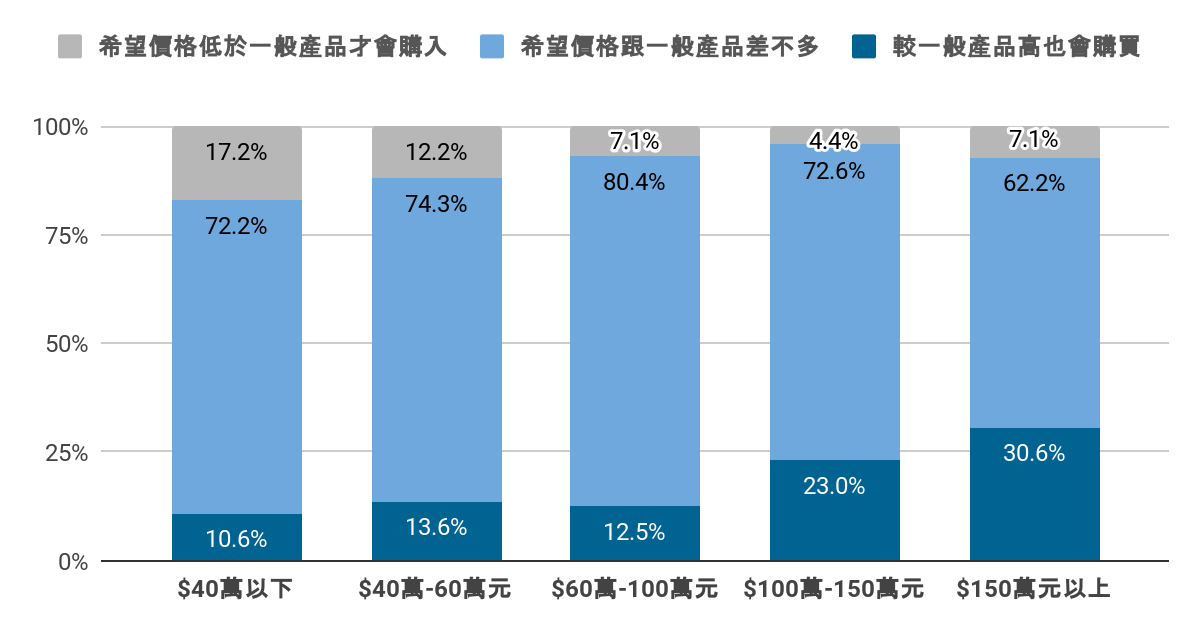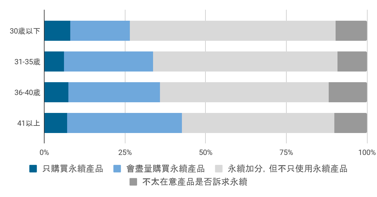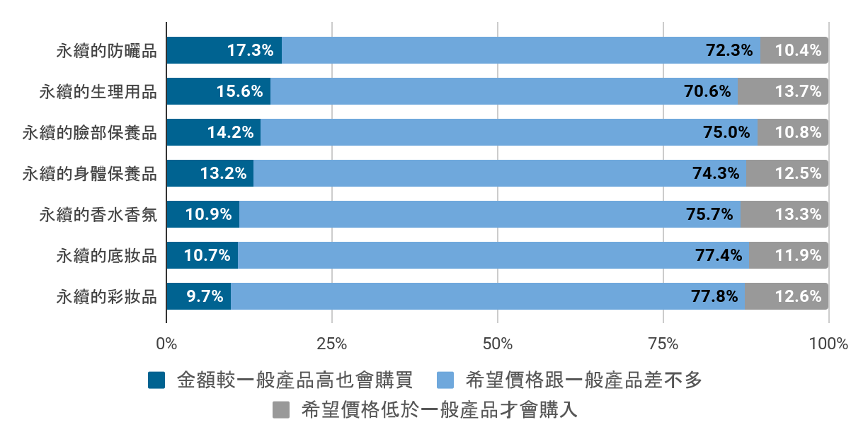 從美妝保養產品的類別來看,超過半數的人表示在意其購買的防曬品是否訴求永續,接著則是重視身體保養品、與臉部保養品兩類別。整體而言,即使產品具有永續訴求,消費者也希望其需花費的價格跟一般產品差不多;但年收入越高者,越願意花費較一般產品高的金額購買永續訴求的產品;從年齡來看則可以看出越年輕的消費者越願意花高價買永續美妝保養品。以產品類別來看,具永續訴求產品的願付金額較一般產品高之類別TOP3依序為:有訴求永續的防曬品、生理用品與臉部保養品。