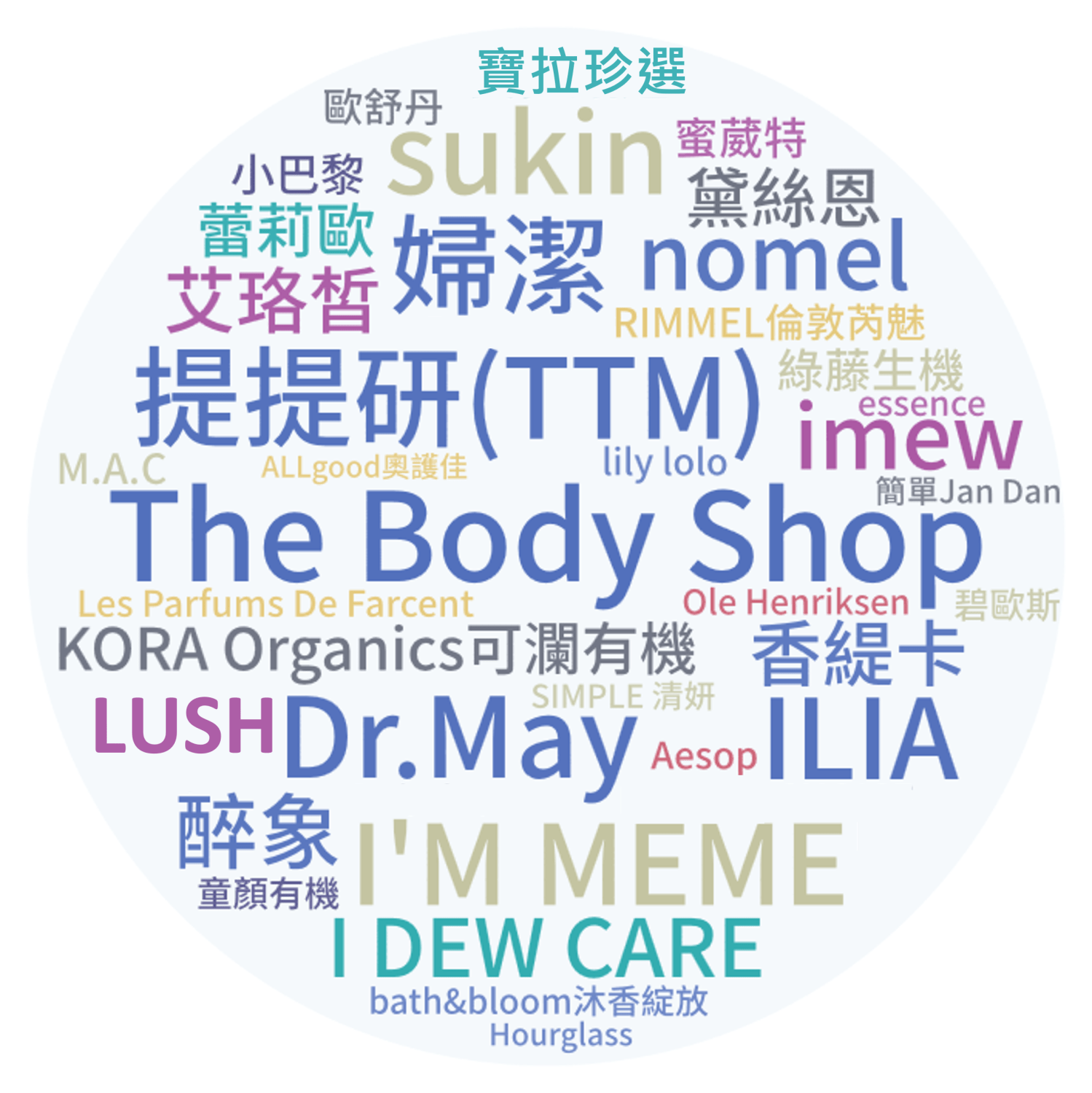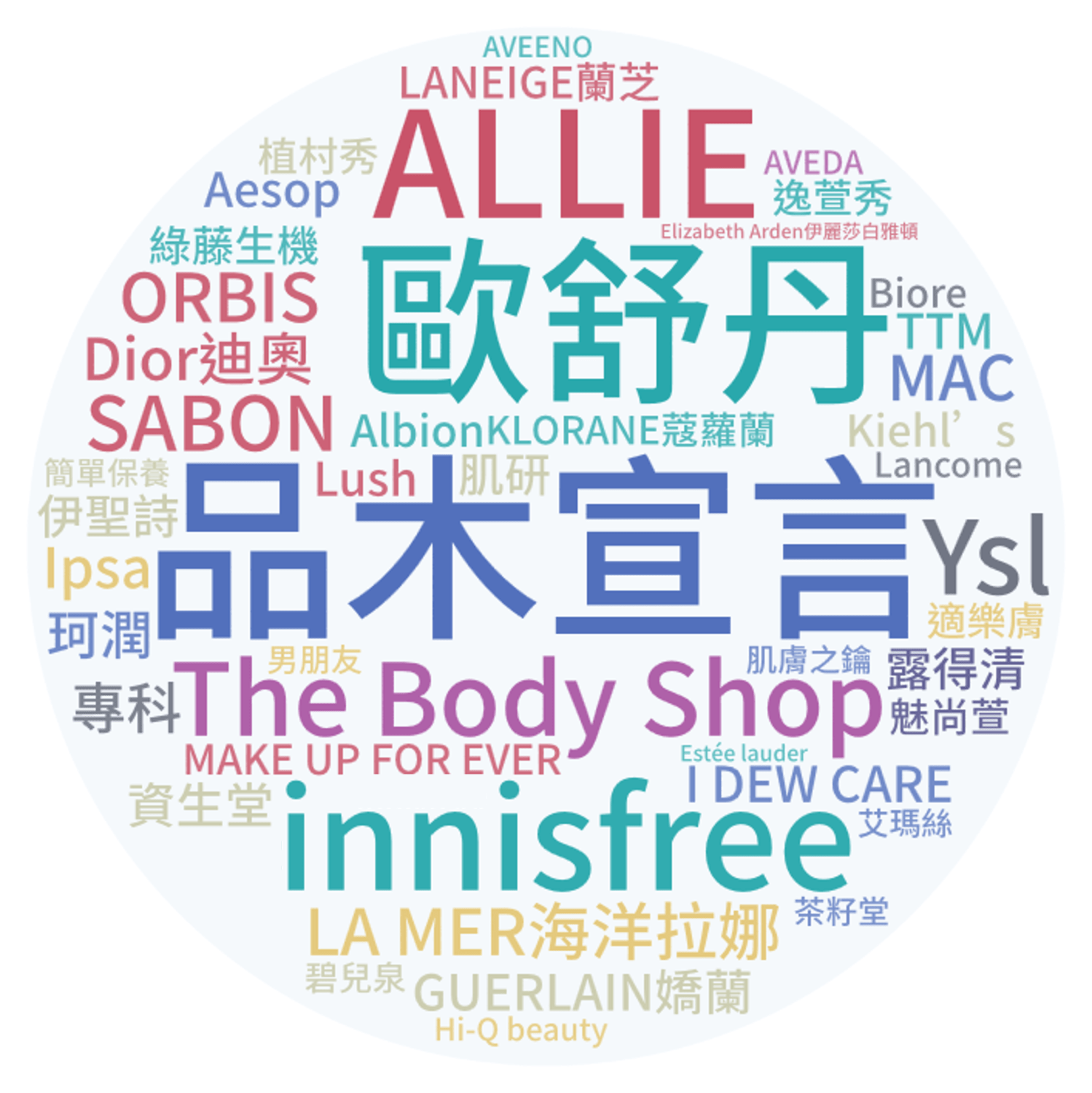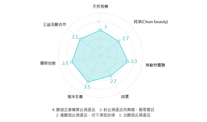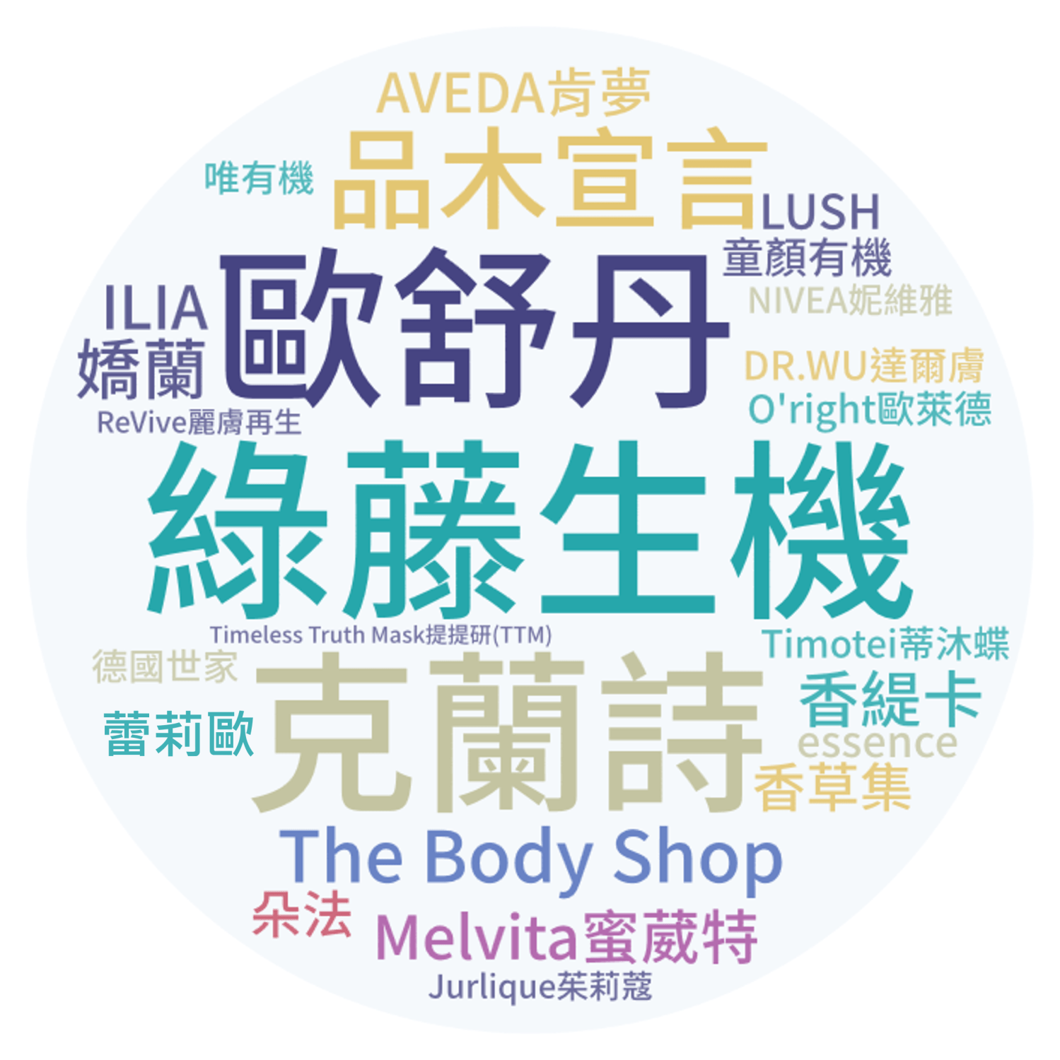 購買「環保包裝」的消費者大部分是希望能愛地球做環保,選擇具有可回收瓶身包裝者占比最多;第一想起的品牌為ORIGINS品木宣言。購買「海洋友善」的消費者表示,以無論是否有去海邊玩、在購買產品前都會注意產品是否訴求海洋友善者為最多;第一想起品牌為ALLIE。購買「無動物實驗」產品中。以拒絕購買不人道動物實驗的產品為最主要原因;第一想起的品牌由The Body Shop美體小舖拔得頭籌。在美妝「公益活動」中,美妝品牌參與「保育動物/環境保育」相關的議題最受消費者關注;育有子女者在「兒童議題」上較無子女者關注高;20代消費者最關注與「貧窮議題」與「教育推廣」有關的公益活動。30歲以上的消費者都更在意「保育動物/環境保育」議題;提到公益活動消費者第一想起的品牌是KIEHL’S 契爾氏。消費者會購買具「天然有機」或「純淨(Clean beauty)」訴求的美妝保養品,占比最高的原因是其成分原料訴求天然。在「純素」美妝保養產品中最多是因為近期「純素」蔚為風潮而購買。這三項訴求的第一想起品牌為Greenvines綠藤生機。