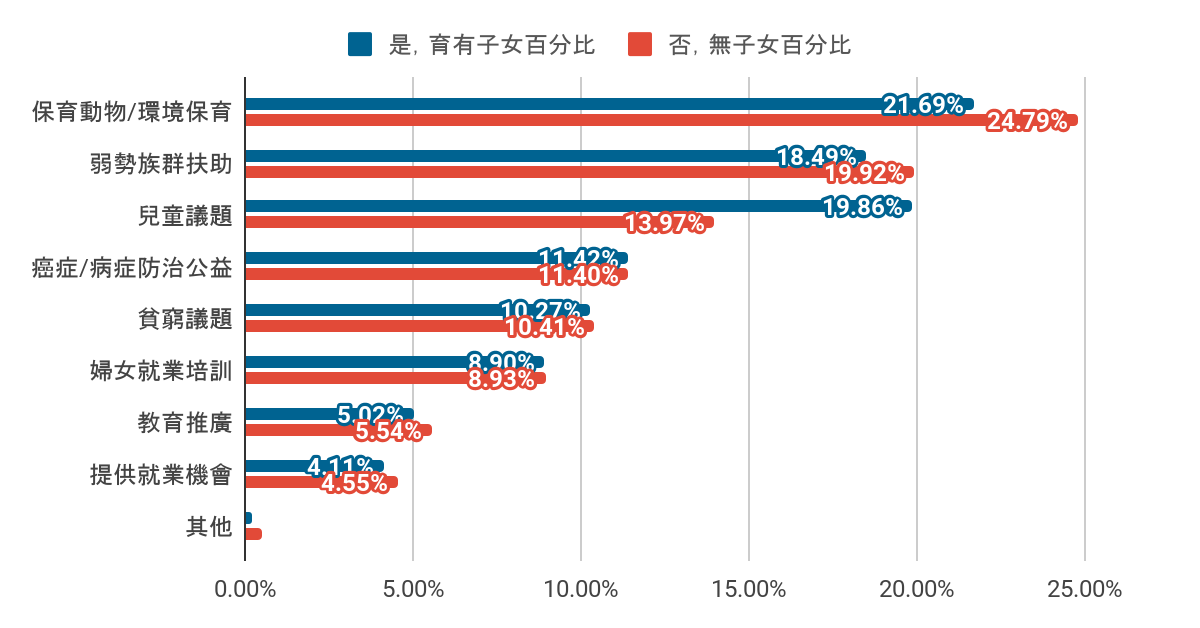 【圖六】消費者關注的美妝「公益活動」議題(有無子女分群)