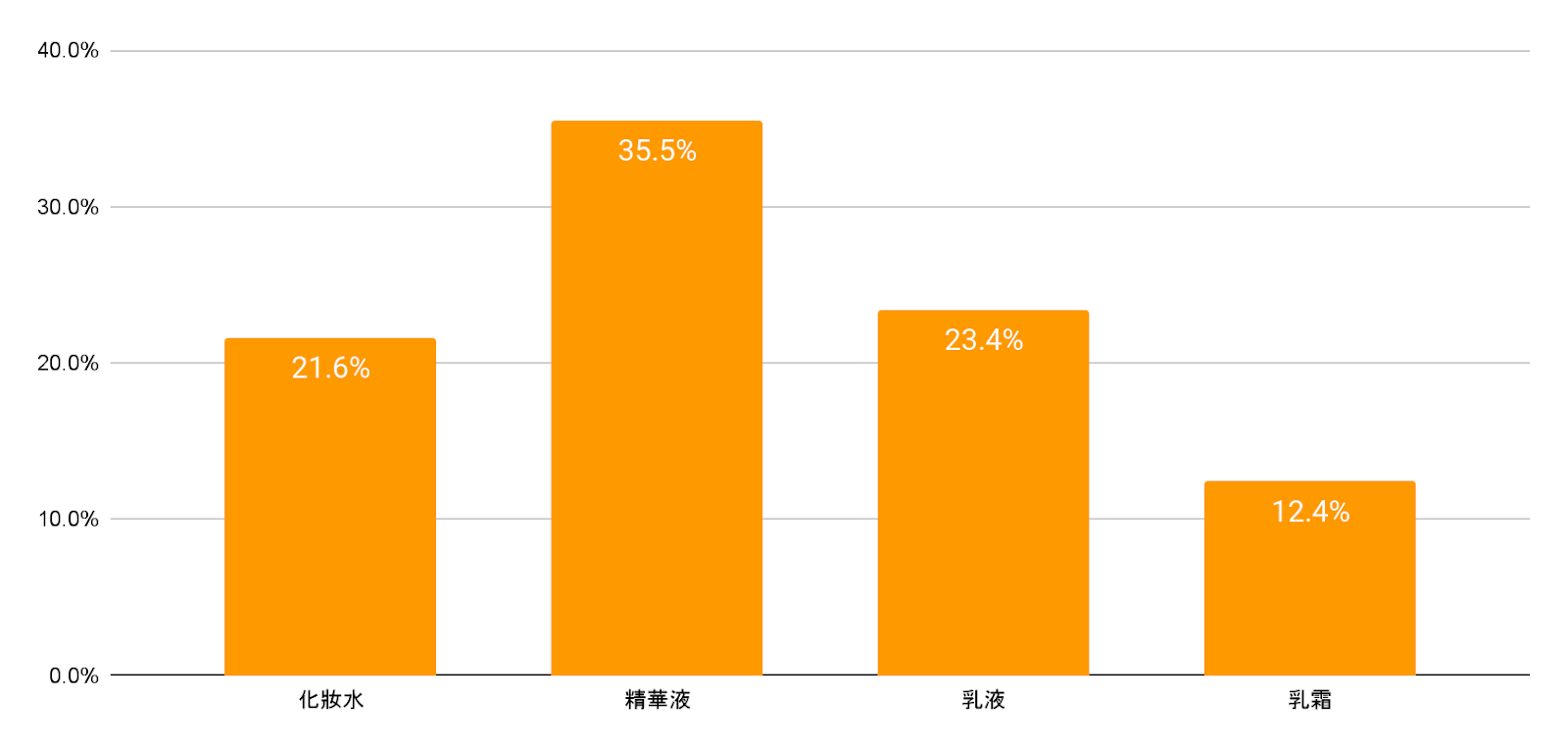 現在消費者在保養品選擇上也更精緻,不止許多人在保養中會融入按摩手法。基礎的四大保養種類,平均在每人的保養桌上都有近兩罐以上正在被使用,並且習慣依照不同情況來調整保養流程。尤其是功效最多變的精華液,每人平均同時有3罐正在使用中,且有35.5%的人會混搭使用。