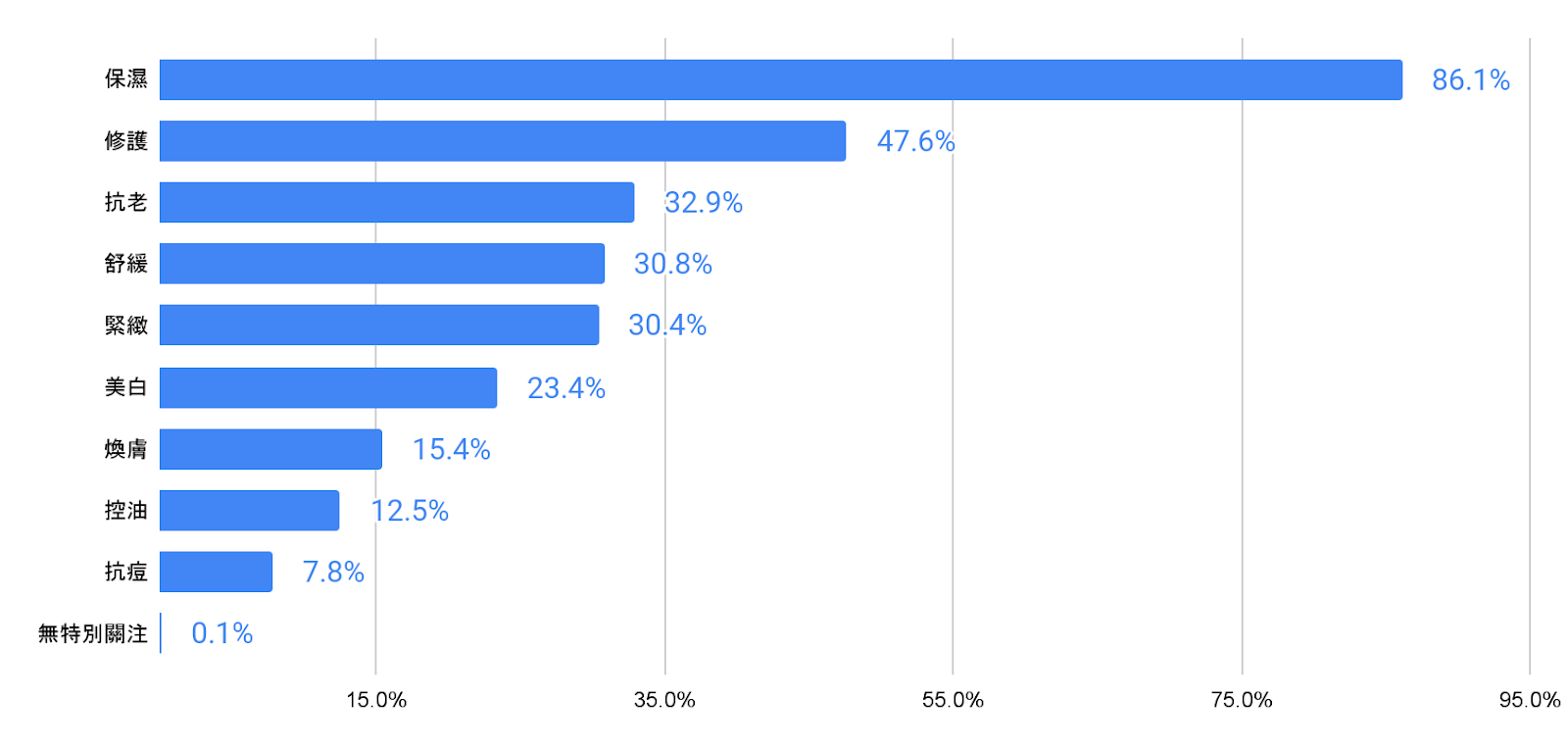 觀察消費者希望從不同的保養品中獲得的效果,化妝水及乳液主要是選擇的三大功效皆為保濕、舒緩、修護功效。