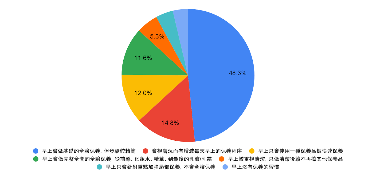 根據本次問卷統計,在早上時有96.4%的人會保養,而晚上則有高達99.9%的人會保養。但再進一步調查大家在早上及晚上的保養習慣,就會發現消費者早上的保養程序大多較為精簡,將近一半的人在早上會選擇只做基礎全臉保養,還有12%的人早上只使用一樣產品快速保養,選擇在早上做完整全套保養的人僅有11.6%。