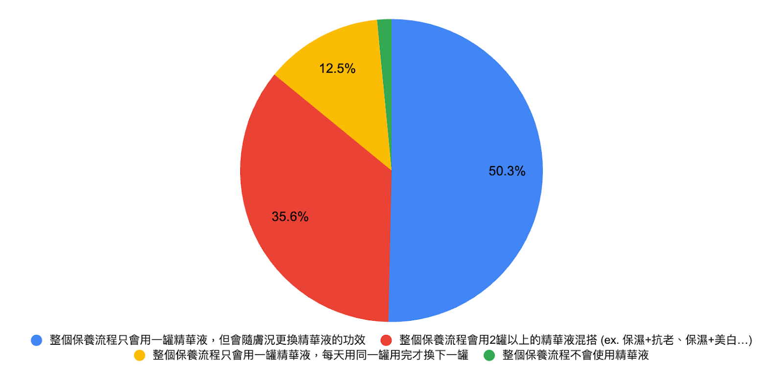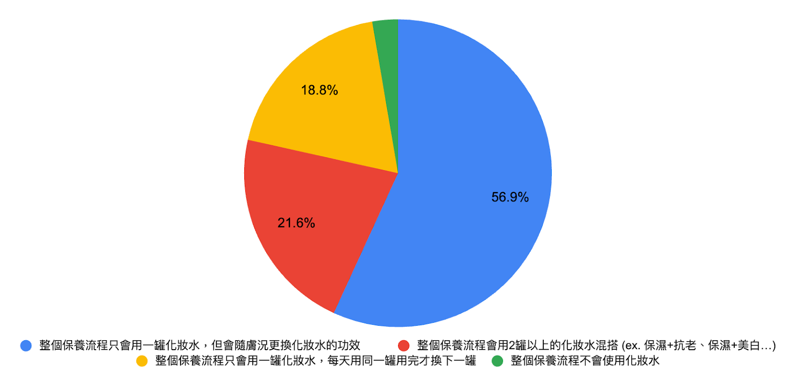 此份問卷可看出現代消費者保養時不再單一的使用固定流程及產品。不論是季節、早晚、流行趨勢或不同膚況,都會影響消費者日常的保養。這些都顯示出現在消費者對於自身保養調整越來越重視及精緻,也花更多的心力來找出最適合自己的各式保養流程!