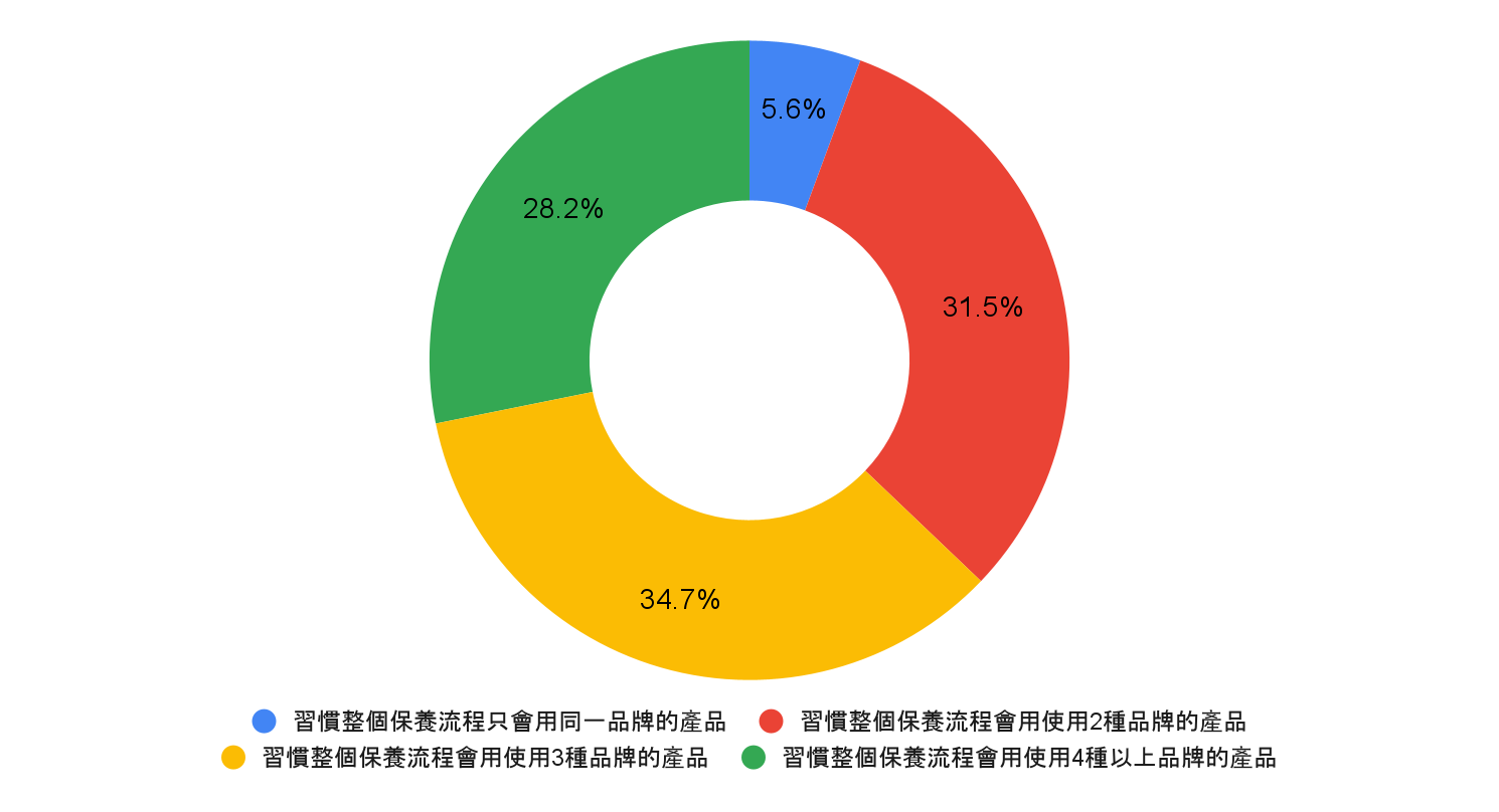 最後也統計了大家平時的保養流程是否會使用同一品牌,34.7%的消費者會使用3種品牌的產品,31.5%的消費者會使用2種品牌的產品,28.2%的消費者會使用4種品牌的產品,只有5.6%的消費者是習慣整個保養流程使用同一品牌的產品。這也顯示消費者在選擇使用保養品時,超過9成都是混合著不同保養品牌在使用的。
