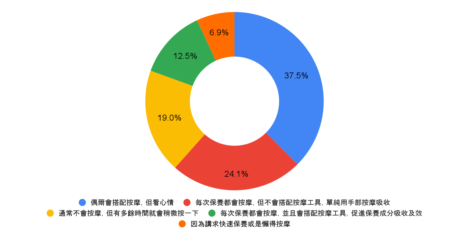 調查消費者在保養中的是否會有搭配按摩的習慣,有37.5%的消費者偶爾會看心情在日常保養中搭配按摩、24.1%的消費者每次保養都會按摩,但不會搭配按摩工具,單純用手部按摩吸收保養品、19%的消費者通常在日常保養不會搭配按摩,不過如果有多餘的時間會稍微按一下、12.5%的消費者則是每次保養都會搭配使用按摩工具,促進保養成分吸收,剩餘的6.9%消費者則因為講求快速保養或是懶得按摩所以沒有這個習慣。