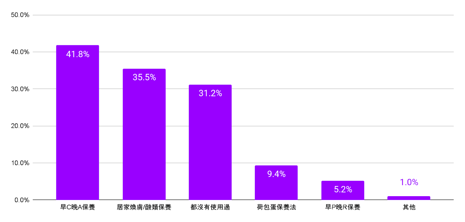 市面上熱門的保養趨勢不段推陳出新,根據統計指出,有68.8%的消費者會跟著時下趨勢調整作保養,其中目前最多人採用的熱門保養趨勢分別為,早C晚A保養法(41.8%)、居家煥膚&酸類保養法(35.5%)。其中大多數人會遵循僅在晚上使用A醇、杏仁酸和水楊酸,維他命C則會在早上做使用。玻尿酸、積雪草這兩個保養成分多數人則會早晚都使用。