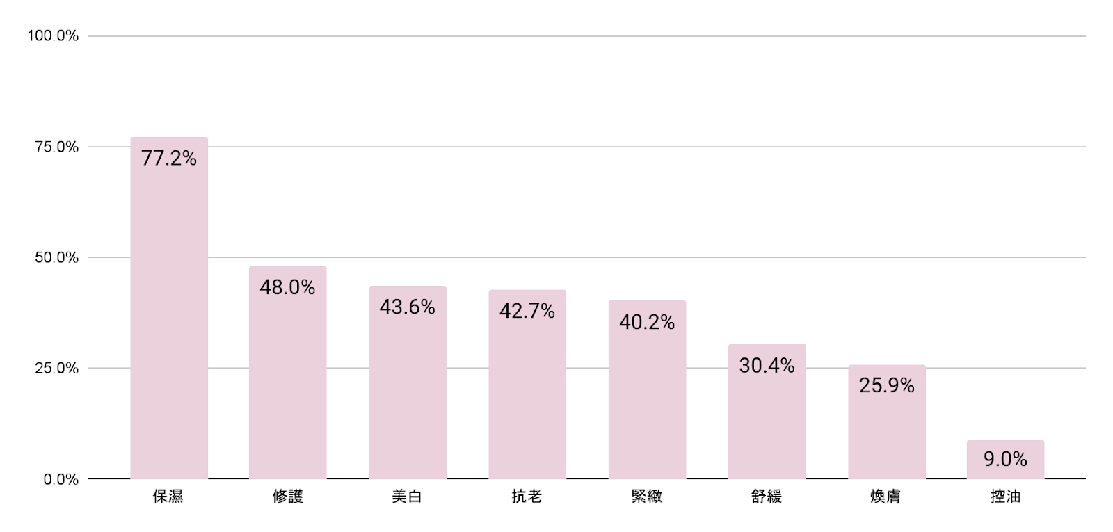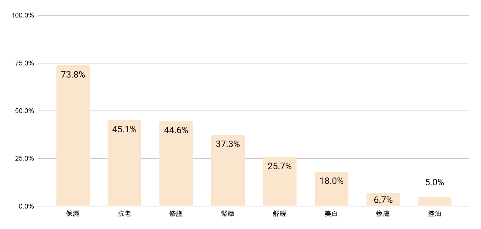 精華液的效果則最為多樣化,最多人選擇的仍是保濕(77.2%),此外修護(48%)、美白(43.6%)、抗老(42.7%)及緊緻(40.2%)也十分受重視;乳霜方面則在保濕(73.8%)、抗老(45.1%)、修護(44.6%)功效較受喜愛。這反映了人們對於在保養程序中追求多重功效,實現更全方位的肌膚護理。
