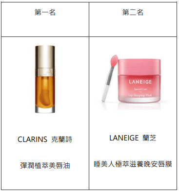 - 唇部保養:另外在【唇部保養】類別中,克蘭詩「彈潤植萃美唇油」、蘭芝「睡美人極萃滋養晚安唇膜」主打唇部的保濕修護,因此受到大家的喜愛!這也呼應了消費者在疫情期間開始注重的保養儀式感已成為習慣,整體保養流程變得更加細緻,能照顧到每吋肌膚的精緻化保養更能搶佔消費者的目光!