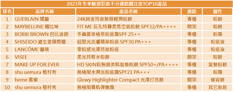 依通路關注度占比而言如圖(9)所示,專櫃通路今年推出大量新品帶動關注度占比成長6.5%,位居第一,並以GUERLAIN 嬌蘭24K純金持妝無瑕輕潤粉餅最受矚目;開架通路關注度占比相對去年成長18.7%,以MAYBELLINE 媚比琳FIT ME 反孔特霧柔焦空氣粉餅 SPF32/PA++++、VISEE GLOW BALM FOUNDATION 柔光持粧水粉餅帶動今年冬季關注度占比成長;而關注度占比第三的網路通路相較於去年下滑57.1%,應與今年疫情解封消費者回歸實體店鋪,再加上專櫃與開架通路大量增加新品有關,圖(10)可見關注度TOP10皆為專櫃與開架通路。再以產品來看,前十名關注度高的產品就有8個為底妝產品,再次證明粉底類在今年冬天新品中的強勢。