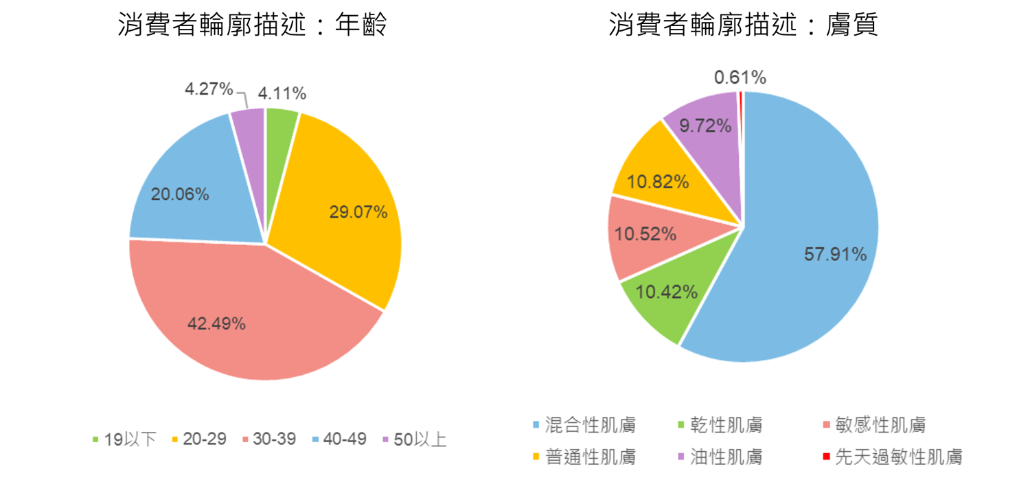 我們先看@cosme平台會員的整體輪廓,在年齡與膚質的分布(如下圖1)。@cosme站上的整體消費者年齡的部分占最大宗的是在20歲到49歲之間,膚質以混合肌為主,其次則是乾性肌、敏感肌、普通性肌膚、油性肌等等。