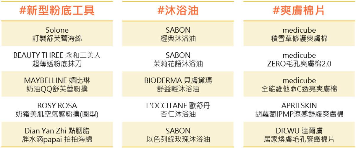 圖(10) 新型態粉底工具、沐浴油、爽膚棉片關注TOP 5產品