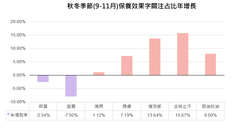觀察美妝效果方面,如下圖(13),針對解決皮脂油光、去除異味、汗水等困擾的美妝效果,在秋冬季(9-11月)的關注度也都比去年有所成長。反之,通常在天氣冷時較受消費者關注的保濕、滋潤等效果,2023的全年關注則有所減少。