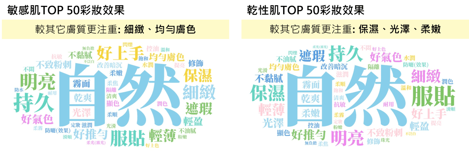 若觀察彩妝效果關鍵字,則會發現敏感肌因臉部較易出現泛紅等情形,比其其它消費者他們更加追求是否有均勻膚色的效果,而粉質及妝容的細緻度也是他們較注重的關鍵字;乾肌的消費者在尋找臉部彩妝品時,較偏好關注強調保濕效果、或是擁有光澤妝感的產品。