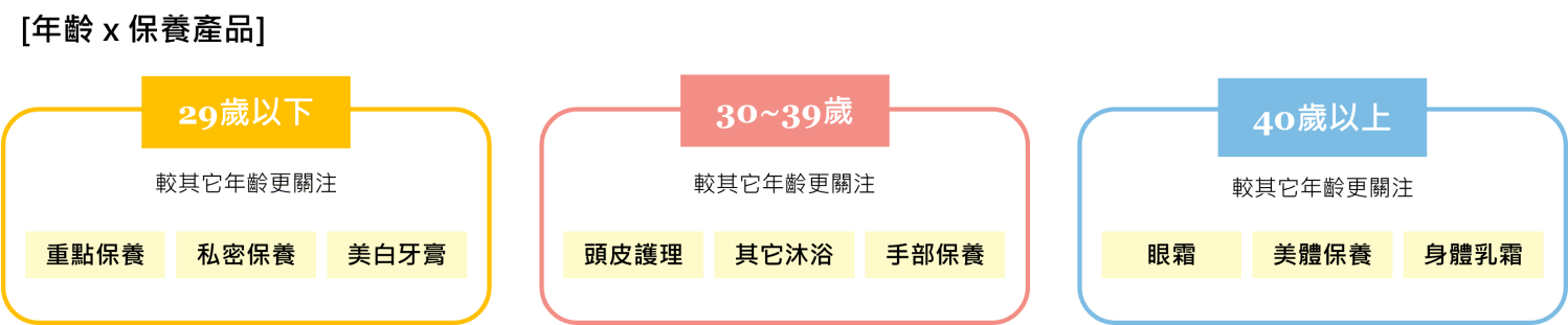 除了膚質會影響消費者的關注外,不同年齡層的消費者在保養產品的關注也不大相同。從下圖(6)可以看出,29歲以下的年輕族群受近年「精緻保養」觀念的影響,相較其它年齡層更加注重如私密處、口腔等細節的保養;而40歲以上的消費者,則明顯較為注重滋潤、抗老相關議題的產品。