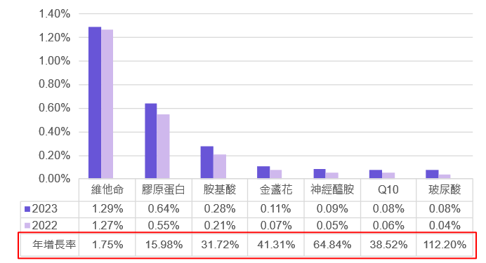 但和疫情期間不同的是,除了維他命C、B群等有助於健康的補給品,在2023年消費者額外注重的,是透過口服來提升「美」的效果,因此像是膠原蛋白、玻尿酸、神經醯胺、金盞花等過往較少出現在營養補給品中的保養美容成分,在2023年也有明顯的關注成長。