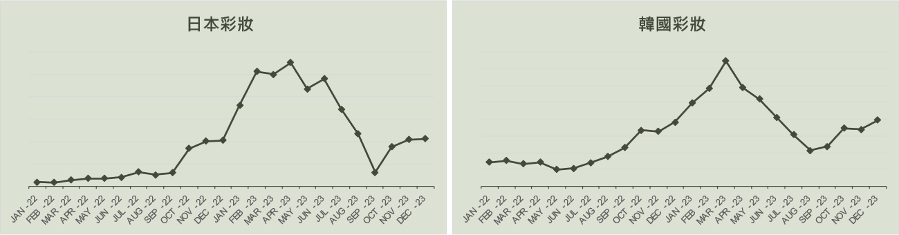 除此之外,自從國境解封後,出國旅行的人數大增,其中又以日本及韓國最受國人歡迎。而許多人到日韓皆會購入當地美妝品牌,因此發現日韓的保養及彩妝關注都有明顯成長,日本及韓國彩妝類的成長又較保養更明顯。