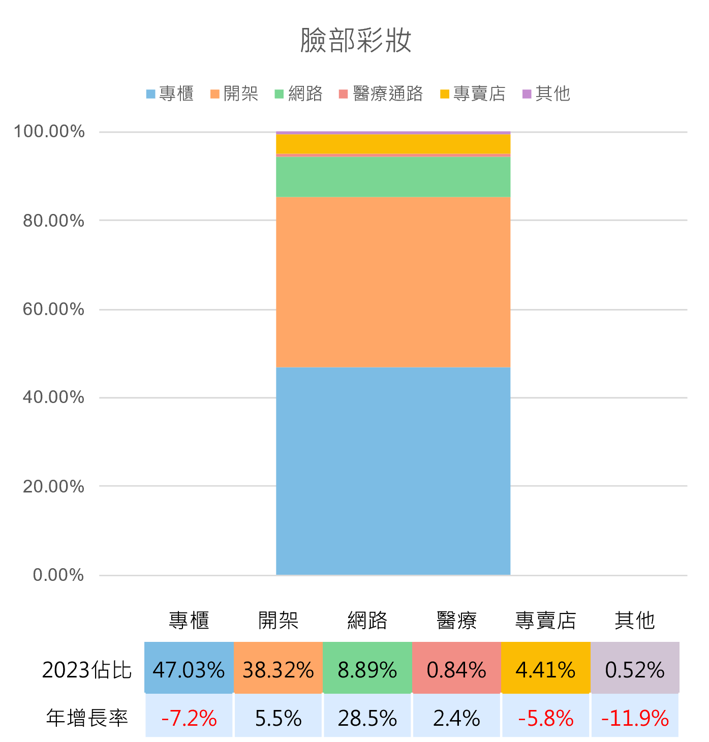 在臉部彩妝通路方面,依舊主要關注於專櫃及開架通路,兩個通路共占了約85%。其中專櫃通路在底妝類產品聲量較高,而開架通路則在彩妝產品更受消費者歡迎。