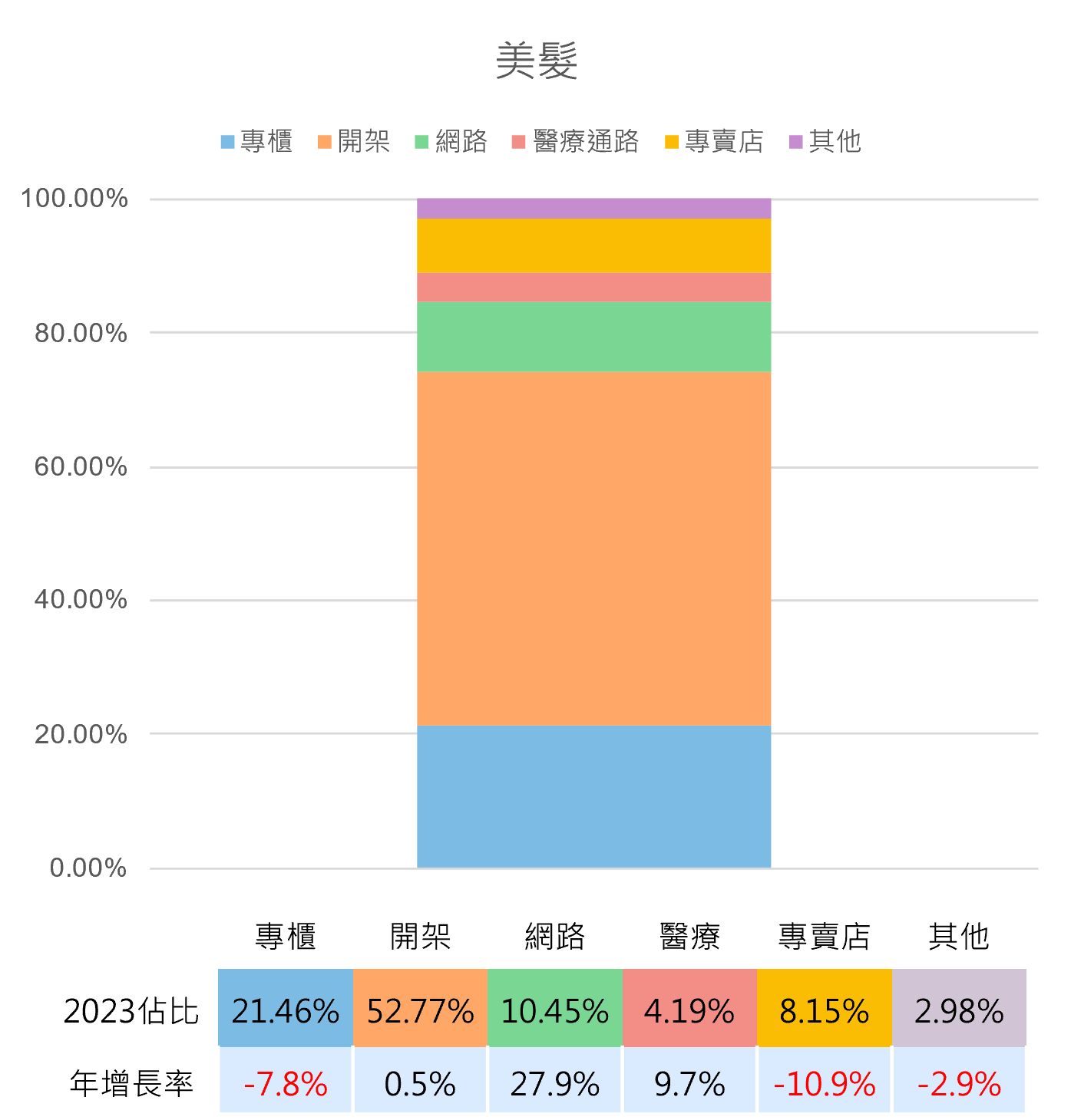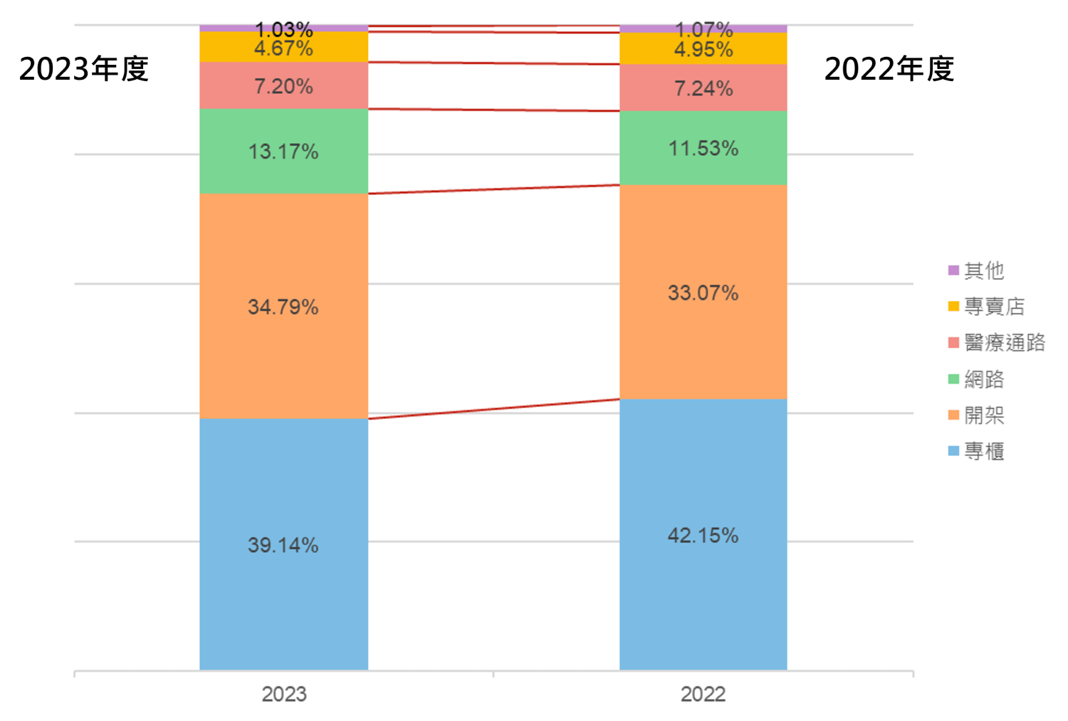 消費者於美髮產品的通路中,主要關注於開架及專櫃通路,其次則是網路與專賣店。與2022年對比,網路及醫療通路關注度上升較多,專櫃及專賣店關注度有所下滑。