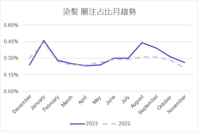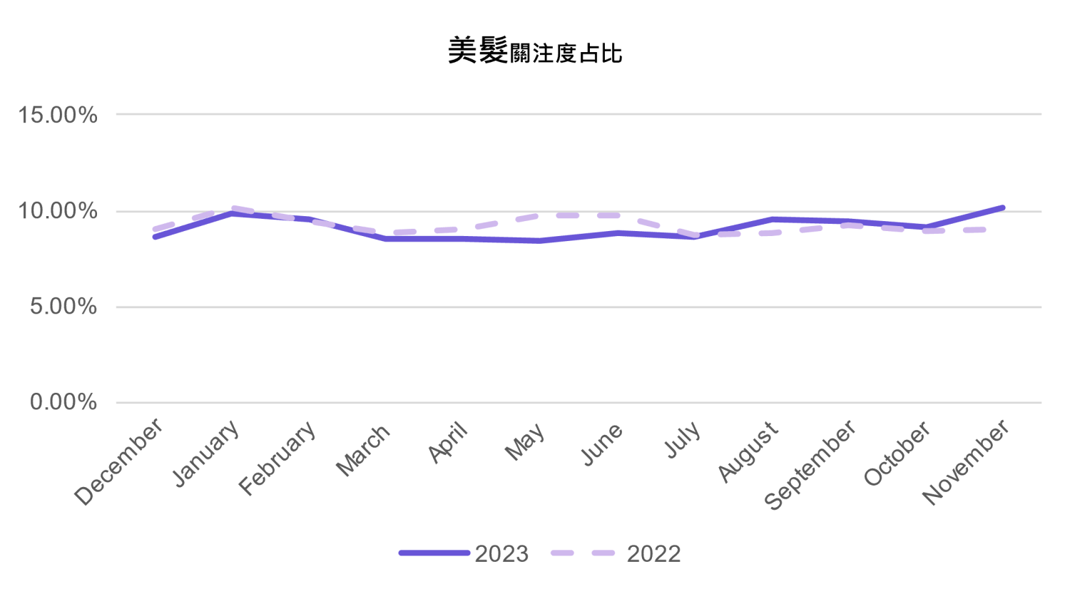 消費者對美髮的關注占比,整體年中較2022年略低,而年末則是2023有些微成長趨勢,但全年總關注占比兩年度相差不大。美髮相較前面幾大類別而言,季節感較弱,全年度的淡旺季較不明顯。