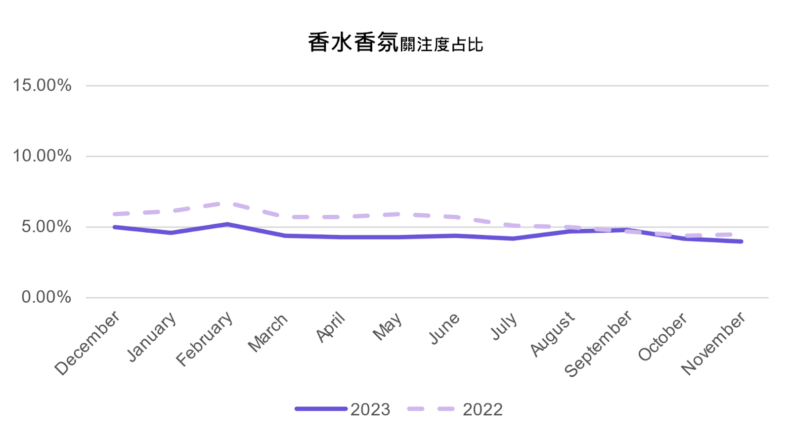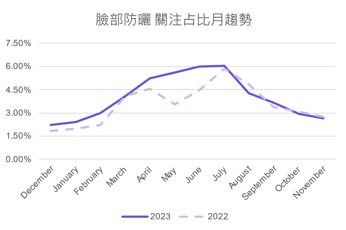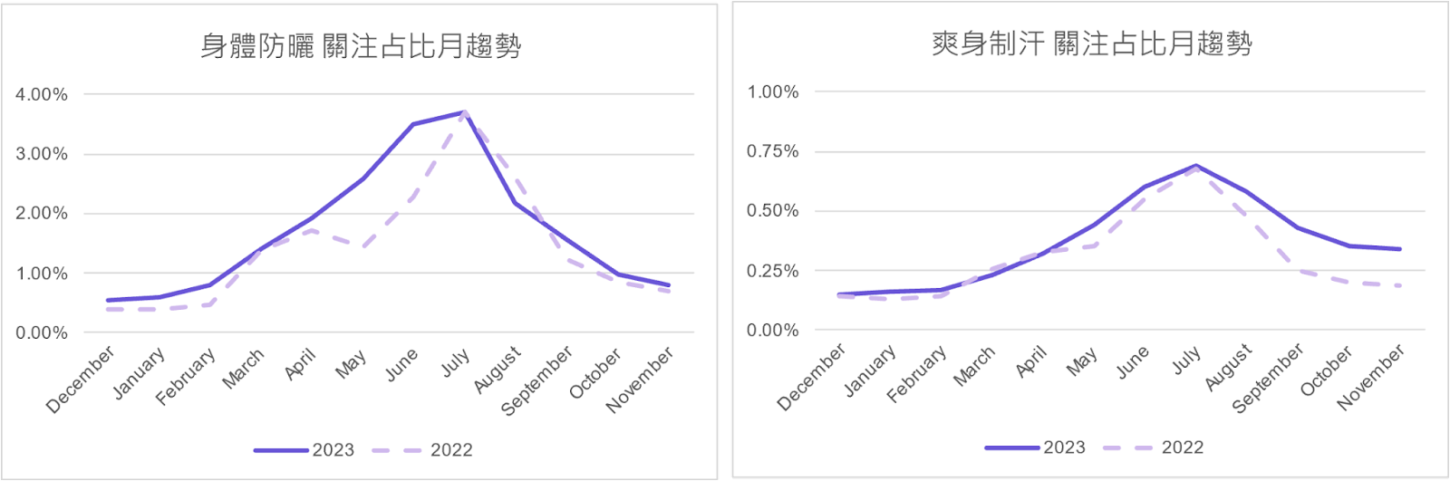 受戶外活動增多影響,可發現除了身體防曬外,爽身制汗產品關注占比都有所提升,加上2023年直到秋冬季也有許多天氣炎熱的日子,所以在9~11月時期關注占比較2022年明顯增加。