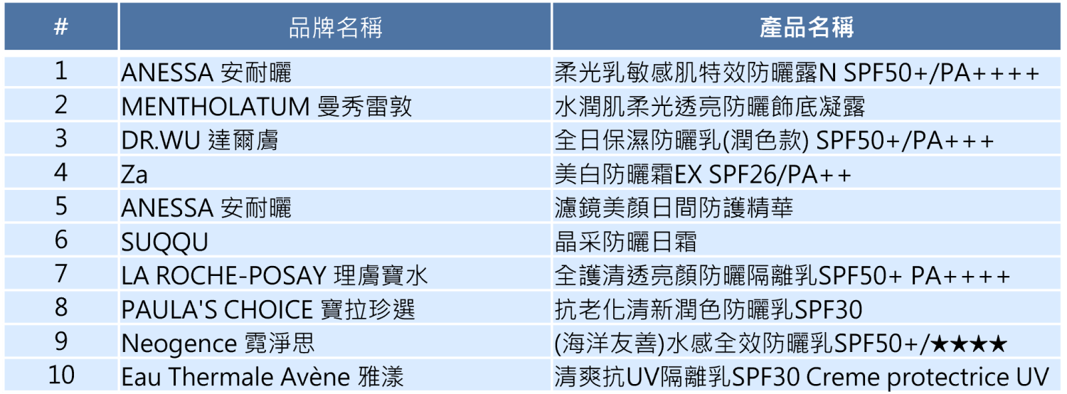 其中成長最多的為臉部防曬,在夏季天氣最炎熱的時期達到關注高峰,根據CMRI 2023夏季新品分析報告,2023夏季的臉部防曬新品數量較2022年度成長57%。觀察2023年度關注度較高的臉部防曬產品(圖6),也會發現質地輕透、水感的產品較受歡迎。