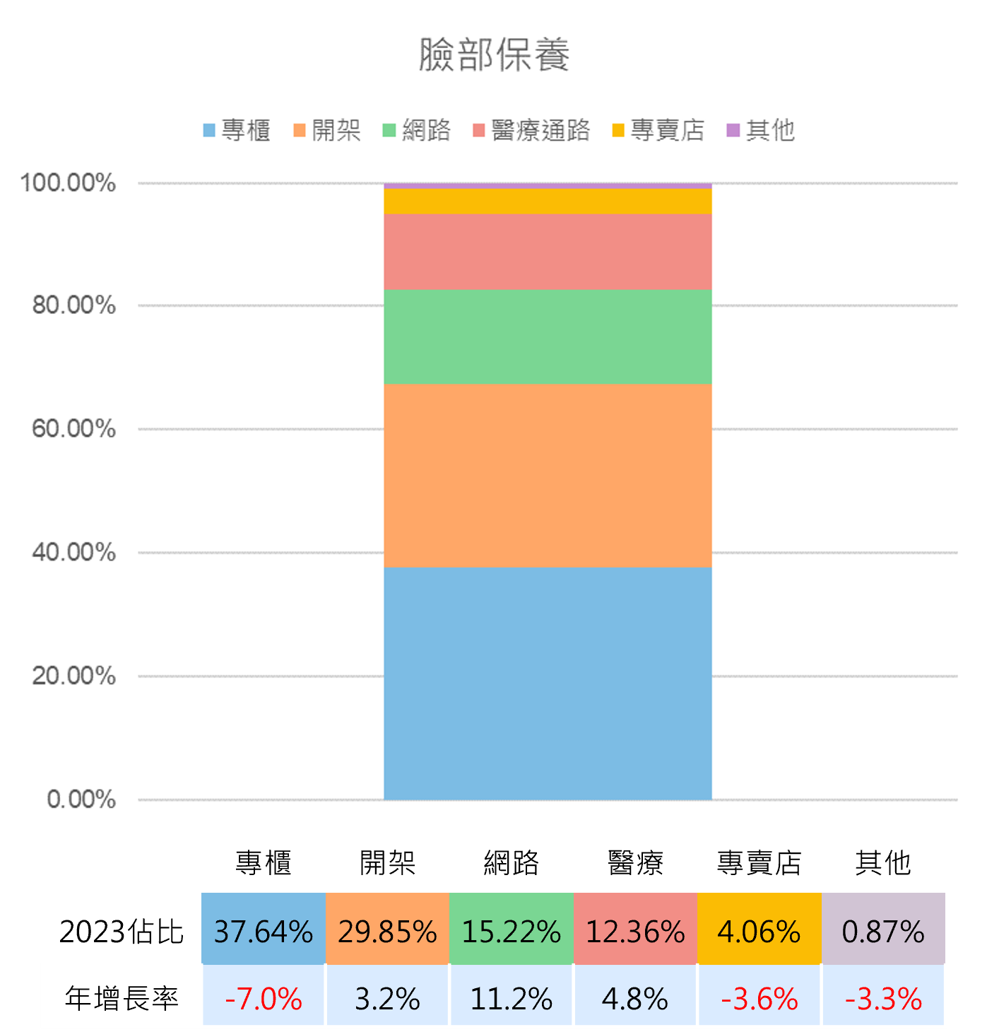 2.各大分類屬性概況與通路分析—臉部保養、臉部彩妝、身體保養、美髮、香水香氛