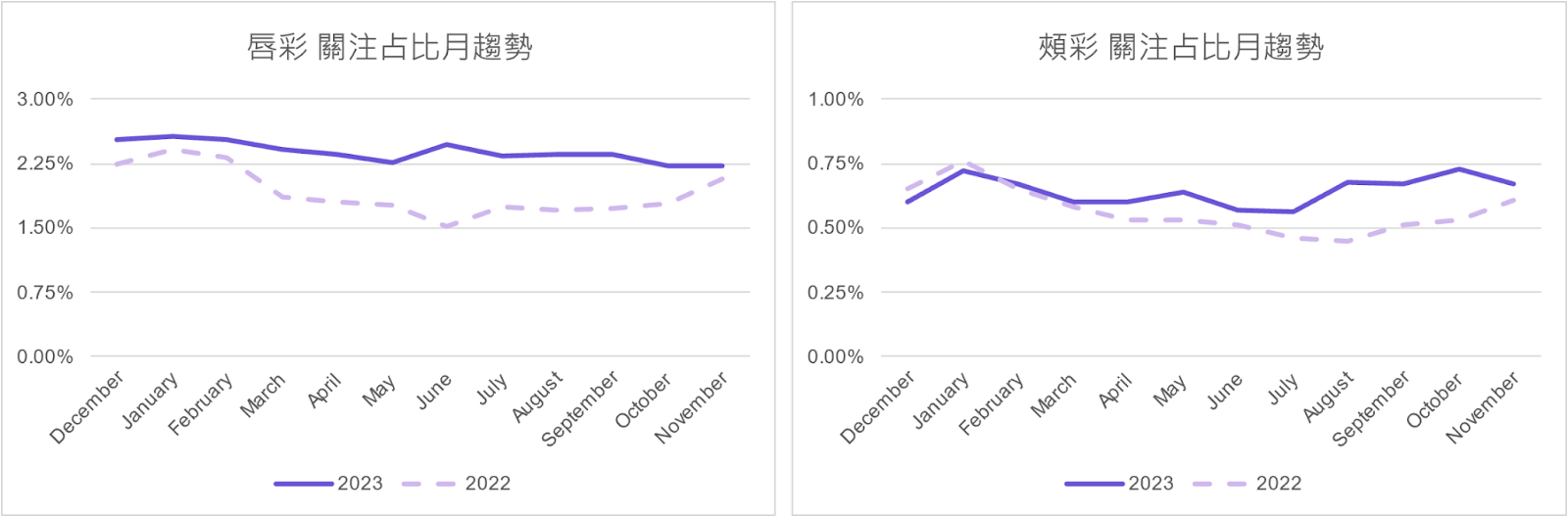 接下來進入2023年度中關注增長最多的臉部彩妝。臉部彩妝全年度的關注占比在2023的年增長率為14.3%,且幾乎所有月份臉部彩妝在2023年度對比2022年度的關注占比都有所成長,顯示著疫情對於臉部彩妝的影響不再;尤其在2.3月開始,隨著2023年2月宣布室外口罩禁令剛剛解除,加上春季彩妝新品推出及母親節預購檔期影響,關注占比為整年度最高時期。