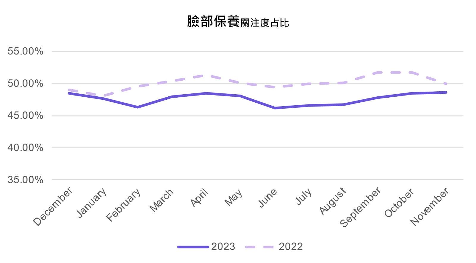 在2023年度中,臉部保養關注占比整體都較2022年度要低,但兩個年度都一樣在母親節及周年慶檔期受優惠活動影響而迎來年間旺季。2023年度占比降低的主要原因為疫情後消費者美妝關注轉移所造成的,2023年度臉部彩妝的關注度占比大幅提高導致其餘屬性占比大多降低。