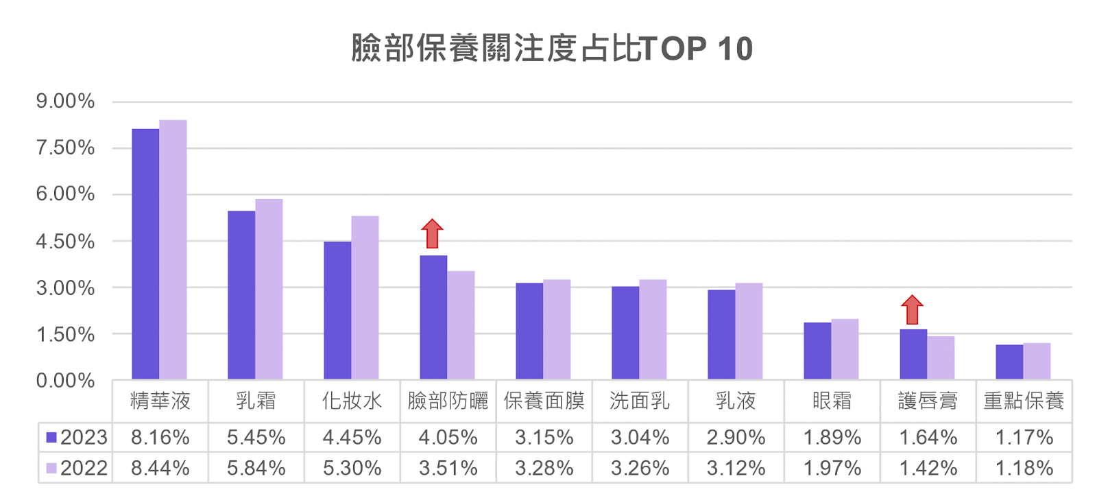 觀察下圖的臉部保養TOP 10屬性關注占比,關注最高的是精華液,其次則依序為乳霜、化妝水、臉部防曬和保養面膜。戶外活動復甦,連帶臉部防曬延續趨勢,關注持續上升中。值得關注的是,護唇膏關注也有所提升,推測和唇彩使用提高及消費者妝前保養習慣有關。