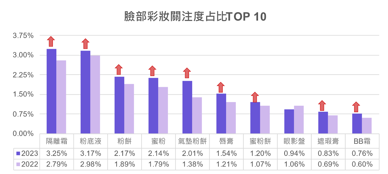 從下圖(11)的臉部彩妝的TOP 10屬性關注度占比,可看出幾乎所有屬性關注度在2023都有所提高,其中底妝類的屬性關注度又較彩妝類高,前十名中就有八個屬性為底妝類,妝前及粉底產品在2023年有許多熱門新品上市或明星商品升級版。