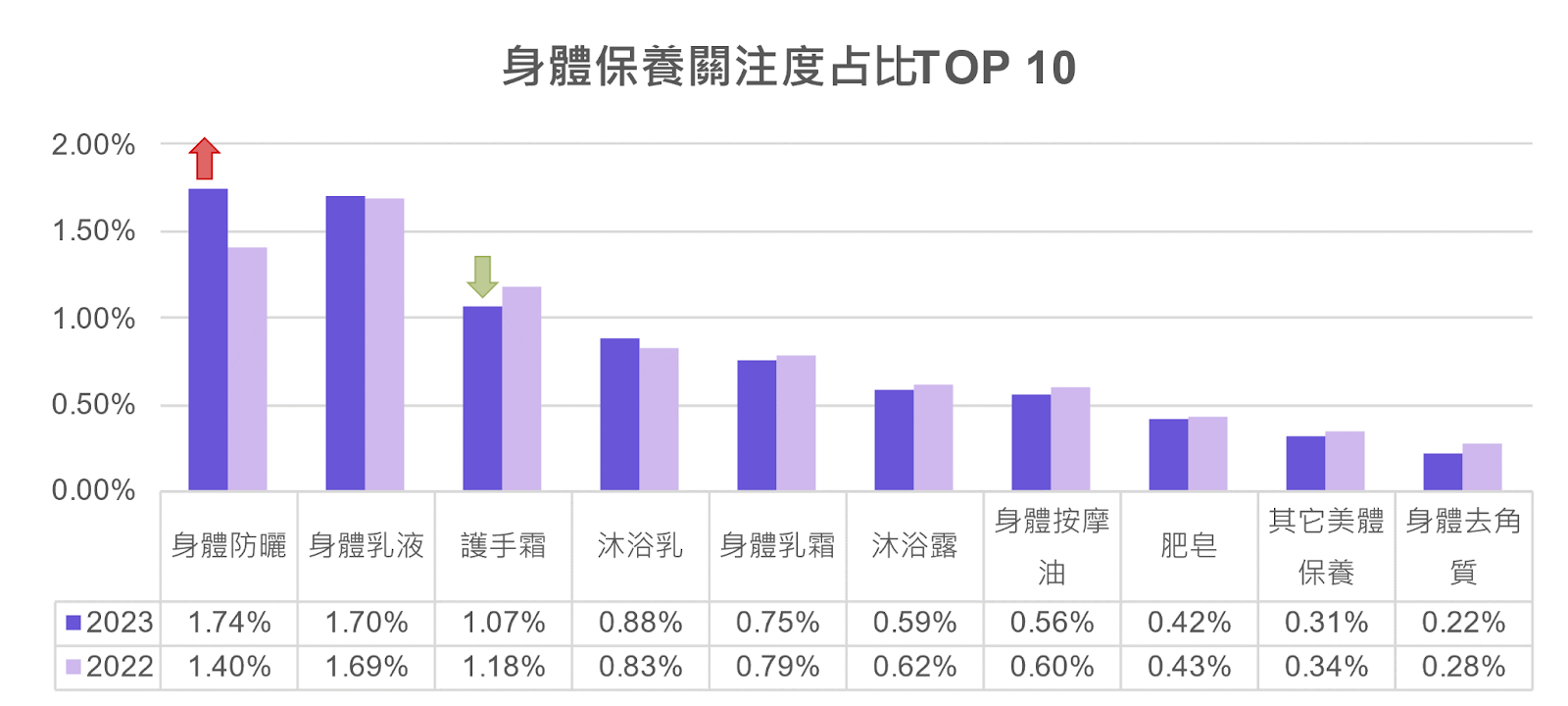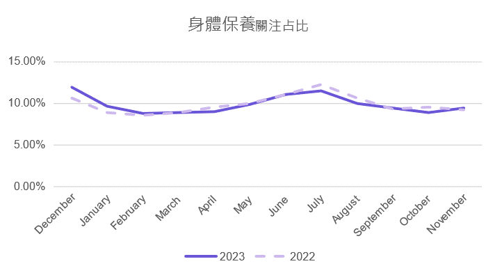 身體保養產品在2023年度和2022年度的關注占比則沒什麼變化,受天氣變化影響進入夏季後,身體防曬及爽身制汗等產品關注提升,而在冬季則有較多消費者會使用身體乳液/乳霜等身體保養類產品,因此帶動整體身體保養關注在夏季及冬季各有一個高峰。