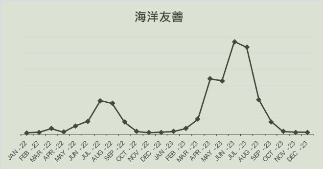 值得一提的是,近年因環保意識的提升,從tag系統中也能夠觀察到,消費者越來越關心「海洋友善」防曬產品,如下圖(19)關注持續成長中,尤其是在2023春夏季有明顯增幅。