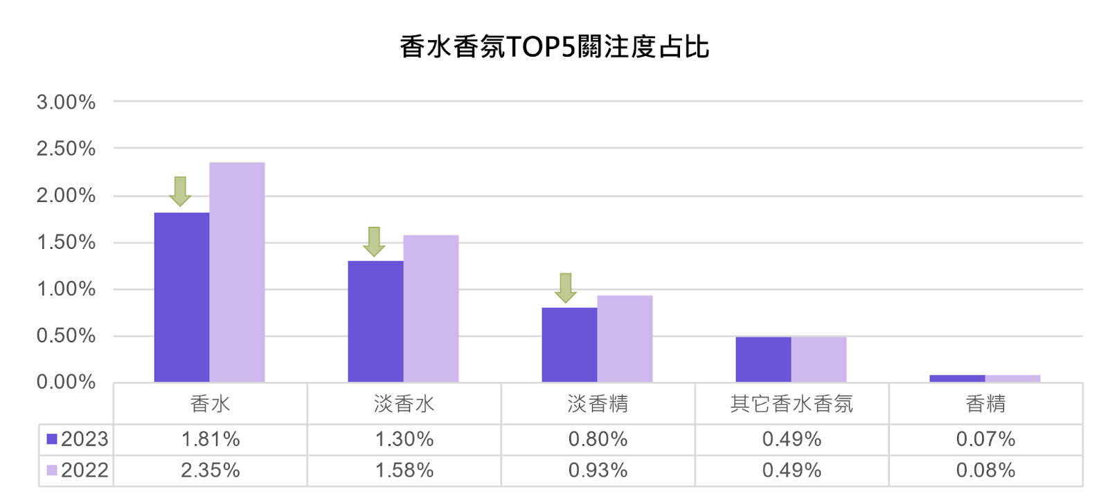 2023全年度的美妝市場整體概況中(如下圖1),關注最高的前兩大屬性,仍然是臉部保養與臉部彩妝,但可發現臉部彩妝在2023年度占比有明顯的提升;反之,臉部保養占比則有小幅下降。另外其他屬性兩年度的占比則無太大差異,只有疫情期間聲量成長明顯的香水香氛熱度有所下降。從這邊就可以看出,隨著2023口罩解封及實體零售恢復,消費者在美妝品的關注有所轉移。
