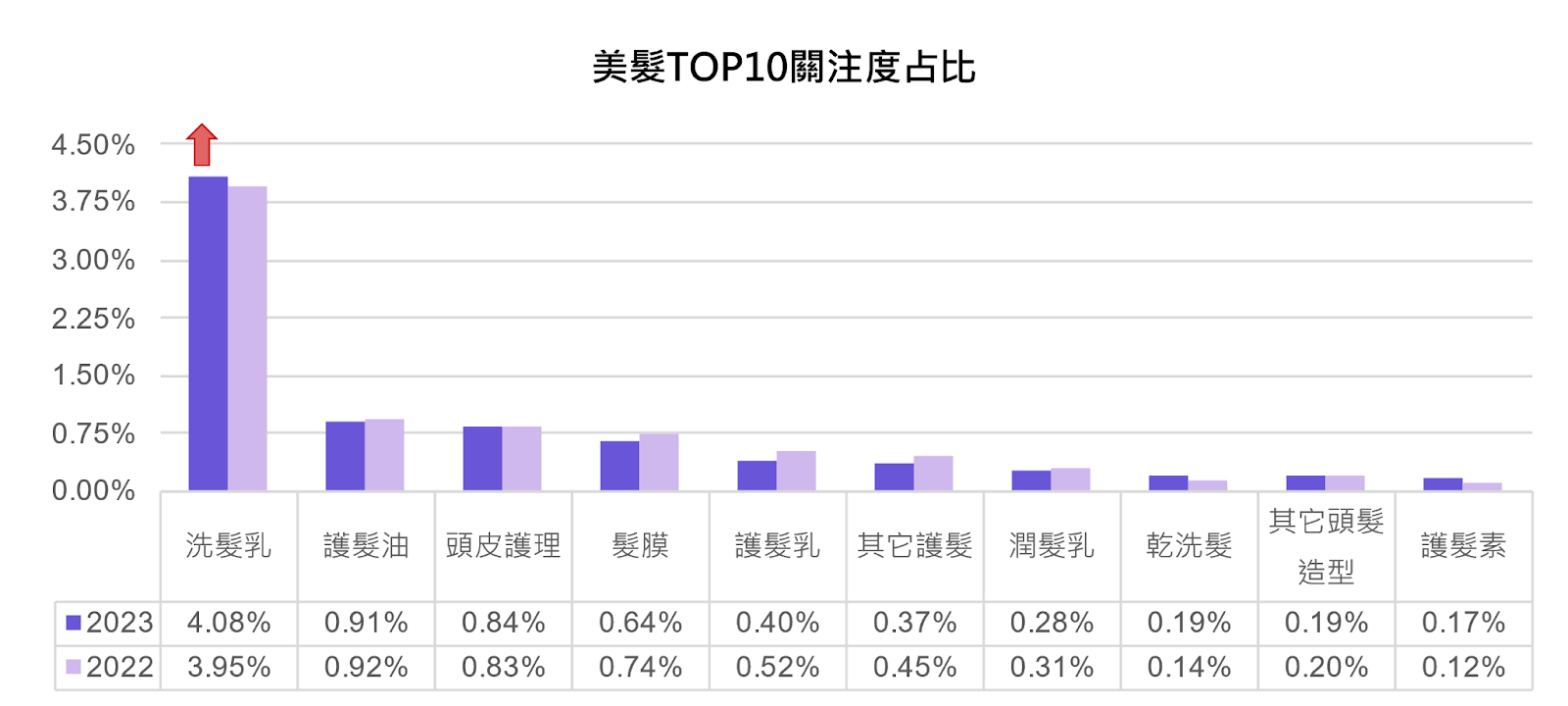 美髮屬性中,消費者最關注的一樣是洗髮乳,其次則是護髮油、頭皮護理及髮油。多數屬性在兩年度的占比差異都不大,而洗髮乳為少數關注占比有所成長的屬性,主要是在2023年末時因新品數量較多(根據CMRI 2023冬季新品分析報告,2023冬天洗髮乳新品數量較2022年成長80%),且有出現高話題新品Cellina 雪芙蘭 養護洗髮精-生薑強韌,兩個原因加乘帶動整體關注成長。