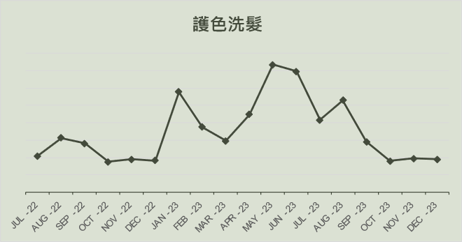 另外,觀察tag資料庫中的美髮相關話題,發現「護色洗髮」的關注也在2023的1月及夏季有所提高(圖23),推測主要原因是新年期間及年末聚會前習慣換新髮色的人數較多,除了到美髮沙龍換新髮色外,居家染髮也是許多人的選擇,因此可發現如下圖(24),染髮屬性也在相似的時間點有較高的關注度。