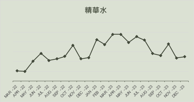 反關化妝水的關注占比則下降較為明顯,除了因為化妝水2023新品較少外(2023全年度新品數量比2022年度減少26%),近期也較缺乏主打的熱門新品,並且近年來十分受消費者歡迎的精華水(屬性為「其它精華」),在許多人的保養流程中會用來取代化妝水的步驟;從下圖(5)我們的tag資料庫中可發現,過去兩年中精華水的關注熱度有所提升,這也間接影響到化妝水關注的減低。