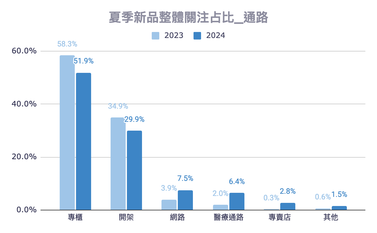 從通路來看的話,我們可以看到2024夏季的專櫃新品數量是有所增加的(增加了13%),但是關注占比卻從58.3%下降至51.9%,開架的美妝新品也有一樣的情形,新品數比起去年同期增加了23.5%,但是關注度也從去年的34.9%下降至29.9%。然而網路品牌卻是完全地相反,即使新品數較少,卻得到了更多的關注量(從去年的3.9%上升到今年的7.5%),在2024夏季新品中表現得相當亮眼,而造成這樣的原因除了MIT品牌的強勢聲量之外(例如:Timeless Truth Mask 提提研、Swissvita 薇佳等等),還有來自於韓國品牌的強勢回歸(例如:PONY EFFECT、I’M MEME、Celluver 瑟路菲),在各屬性中有著備受消費者喜愛與關注的新品。
