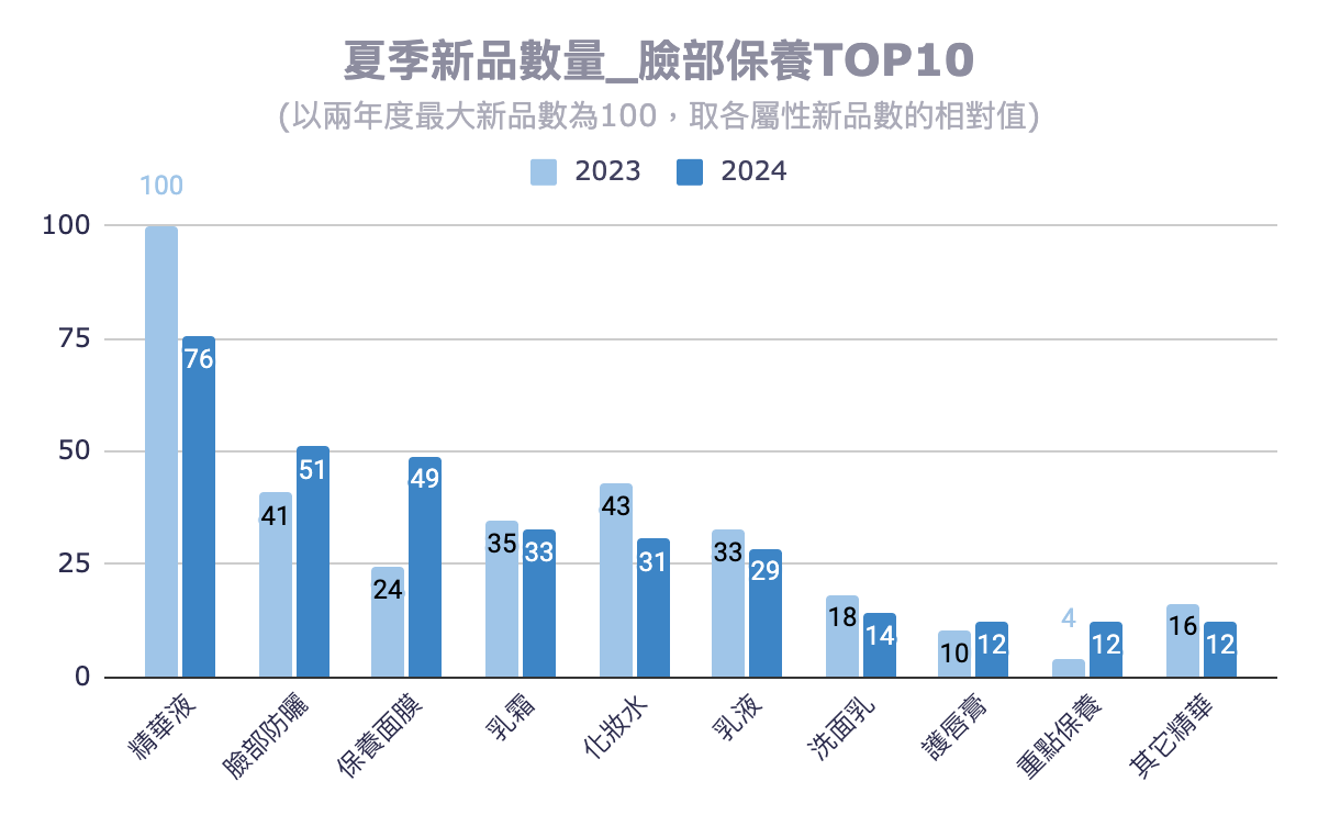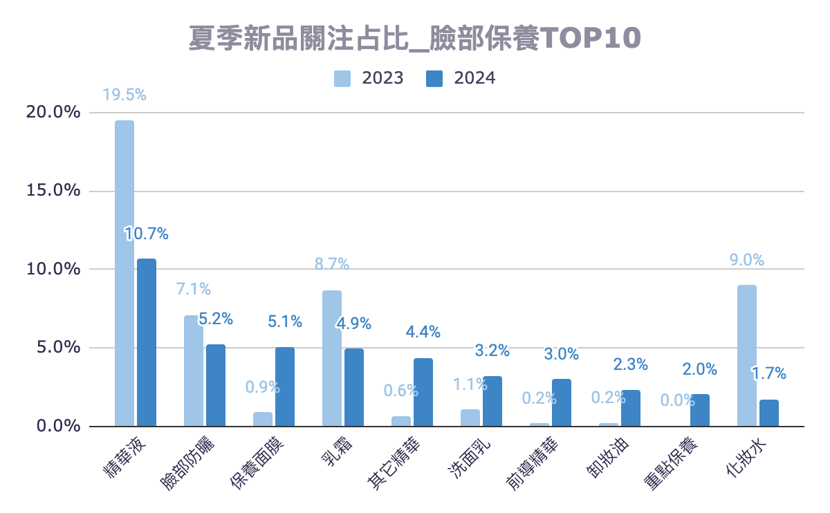 首先先從2024總關注占比最高的臉部保養類開始,今年夏季的臉部保養新品總數較2023年度減少了11.7%,總關注度也較去年度降低40%,是七大類別中關注度下降最多的類別。觀察圖(5),可以看到新品數量最多的前十名中,精華液和化妝水的新品數量有較為明顯的下降,數量增長的有臉部防曬、保養面膜、護唇膏、前導精華與重點保養。