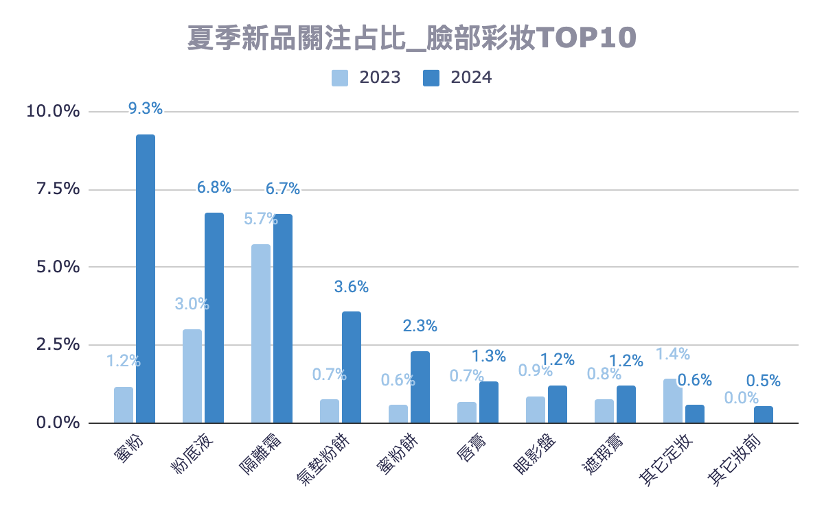 圖(10) 2024夏季新品臉部彩妝關注度TOP 10產品