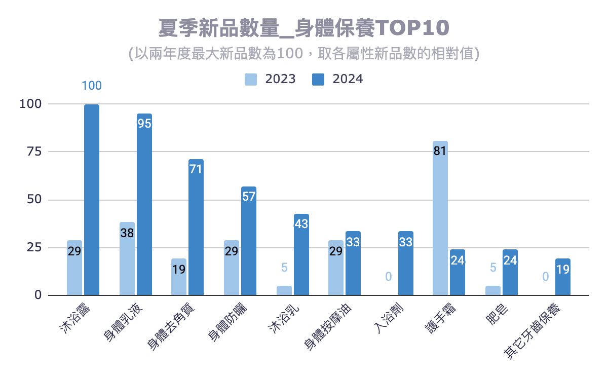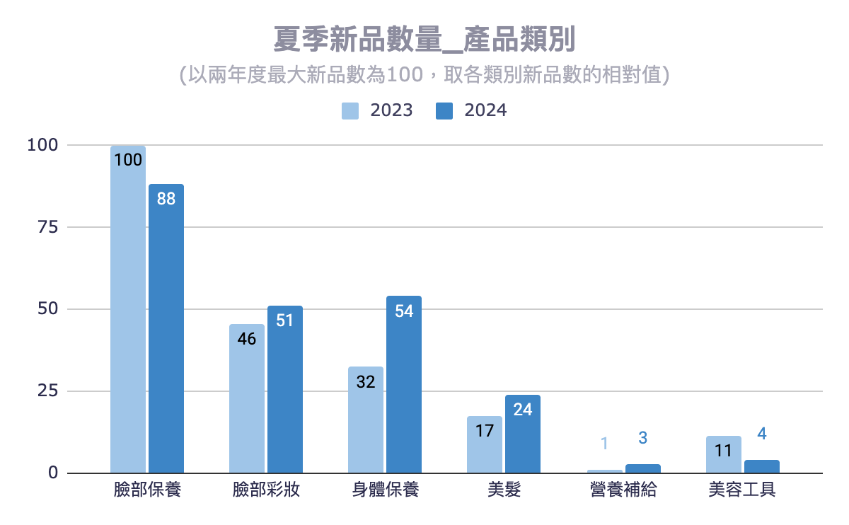整體來說,2024夏季新品數量比2023年稍微提升,但新品數量的增加大多是增加在相對沒那麼熱門的產品類別(身體保養、香水香氛),比較沒辦法引起消費者太大的關注。另外,臉部保養常常都是做為最受歡迎的新品類別,但是今年的臉部保養新品數量銳減,也是造成2024年夏季新品整體的關注度比起去年是呈現下降的一大主因。