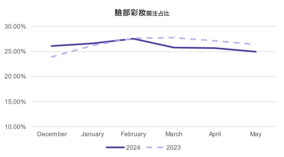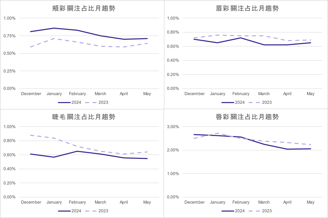 彩妝方面,除了頰彩在2024上半年關注大幅增長外,其餘彩妝的整體關注都較2023上半年低。眼眉彩在口罩期間仍有不少消費者選擇使用,反觀唇彩、腮紅、修容等產品因口罩影響在前幾年關注較低。因此對比這兩年會發現,各種不同部位的彩妝占比走勢的差異。