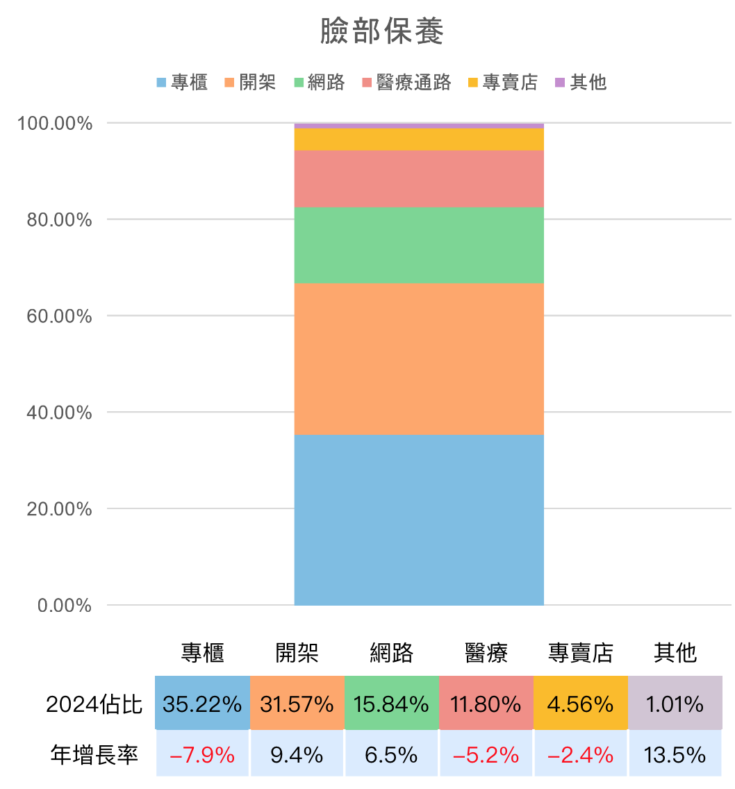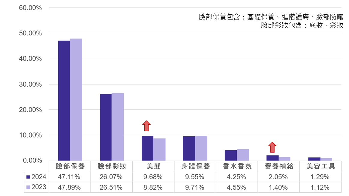 2024上半年的美妝市場整體概況中(如下圖1),臉部保養與臉部彩妝仍然佔據最大宗,和2023上半年做對比,可發現在2024年度兩大類別的占比都有小幅下降;反之,美髮及營養補給占比則有較明顯的提升。