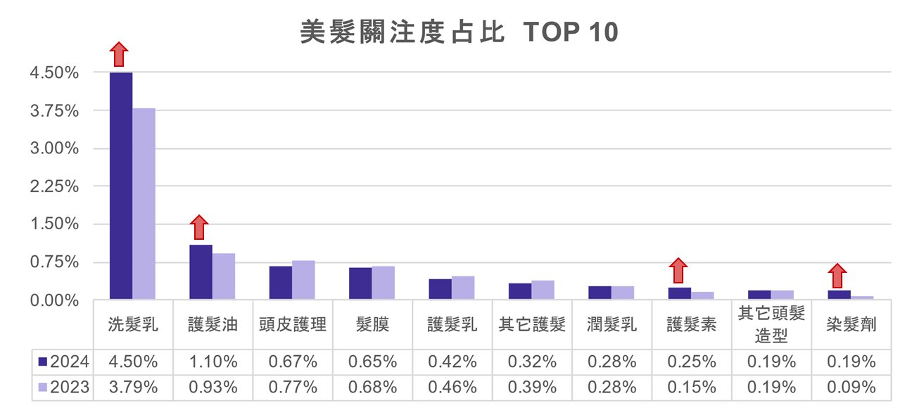美髮類產品中,仍然以洗髮乳最受關注,且在今年又進一步提高。另外,護髮品及染髮也都有不小的關注提高。